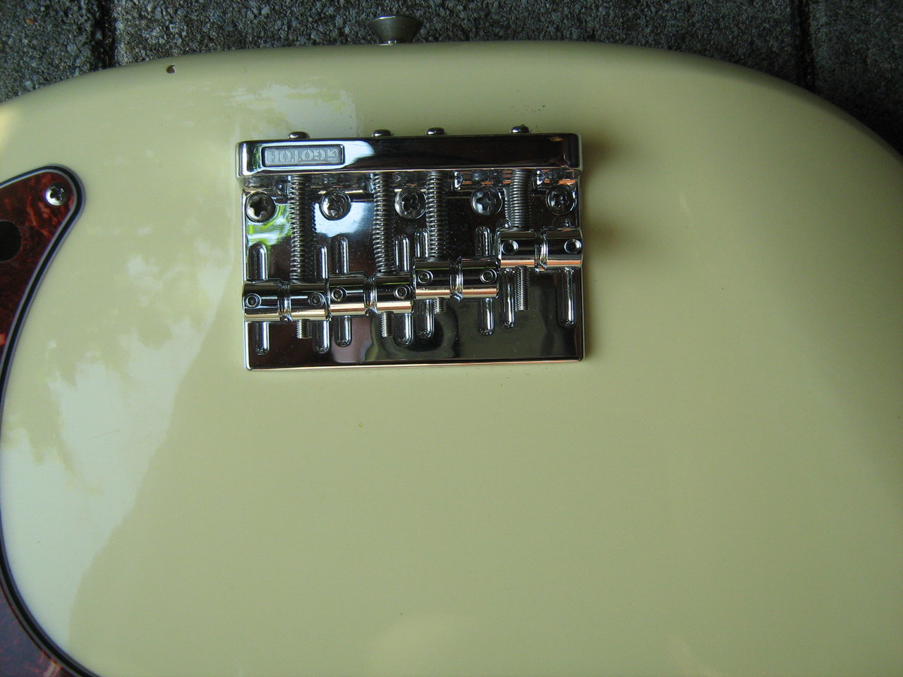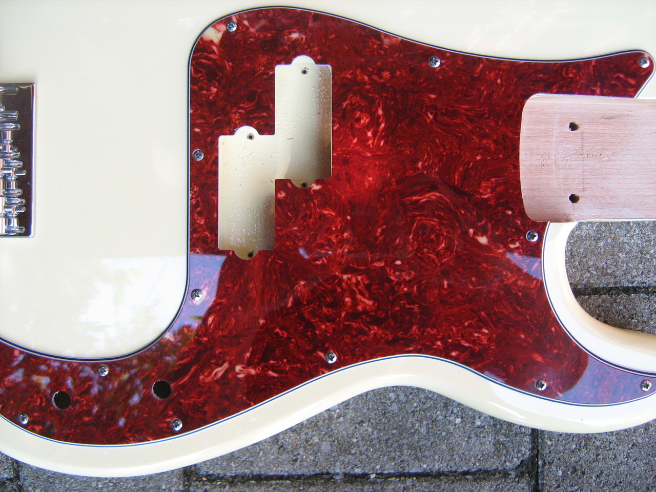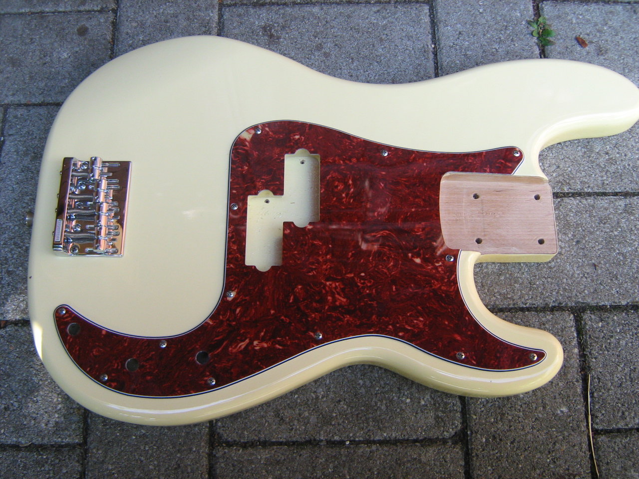 zum Verkauf steht diesmal ein P-Bass Body (Erle) von Herrmanns Guitars in "Matt-Freeman-Pferdezahn-Gelb". Guter Zustand, 1-2 kleine Dings sind vorhanden (siehe Fotos), eine Gotoh 201 Bridge ist montiert, das sehr schöne Tort-PG ist von Boston und gehört ebenfalls zum Angebot.