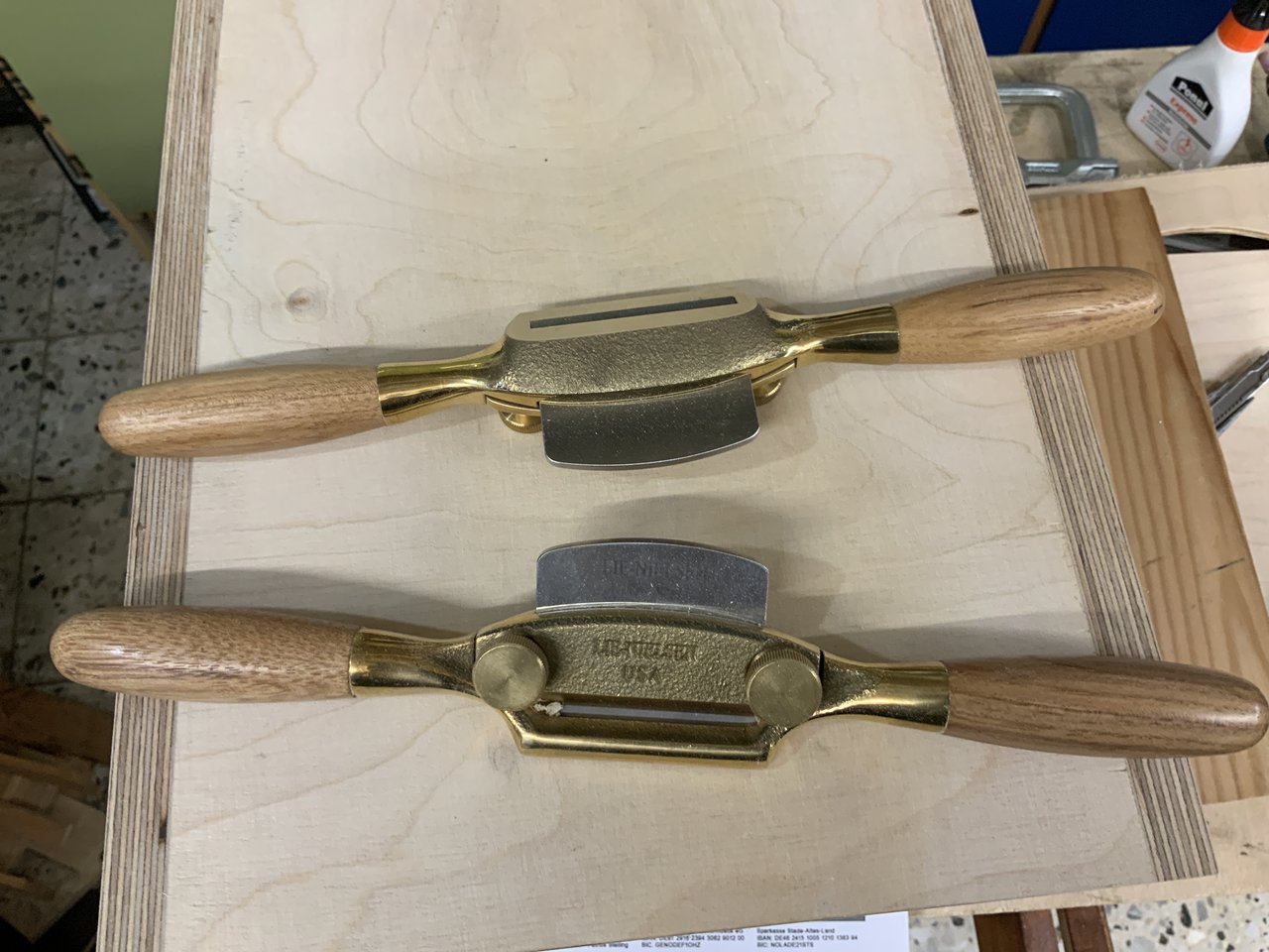 ( nur noch mal schnell was fertigmachen und so…) Das ist aber vielleicht auch nur so ein Gefühl. Bei dem kleinen Nielsen hatte ich am Anfang meine Schwierigkeiten, das war, als ob das Eisen eine Weile gebraucht hat. So richtig gut war der irgendwie erst nach den ersten zwei-drei Nutzungen und neuem Abziehen und polieren der Klinge mit dem 8000er Wasserstein. Den kleinen Handhobel hab ich sogar erst mal weggelegt. Ich musste auch das Maul ein bisschen nacharbeiten, da war kaum Platz für einen Span. Die Eisen der Spokeshaves hab ich gleich poliert, die beiden Dinger haben von Anfang an Perfekt funktioniert. Der Name kommt von der Nutzung an den hölzernen Speichen der Kutschen- und Wagenräder. In Wirklichkeit sind sie für eine große Anzahl an kleinen Aufgaben unschätzbar vielseitig einsetzbar. Die Einfachheit ist dabei das tolle. Nur gut geschärft muss das Eisen sein. Sonst ist es eine Qual.