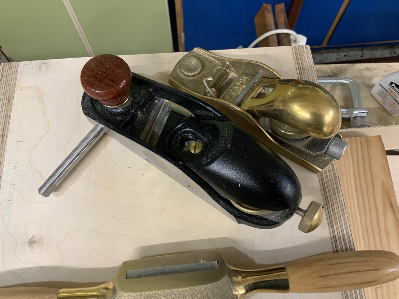 Die zwei Handhobel, der Veritas ist der meistbenutzte, unglaublich vielseitig dank der offenen Schulter, damit kann man z.B. große Zapfen auf den Flanken bearbeiten, es bleibt kein Rand, weil das Eisen so einstellbar ist, dass es bündig mit der Außenflanke abschließt.