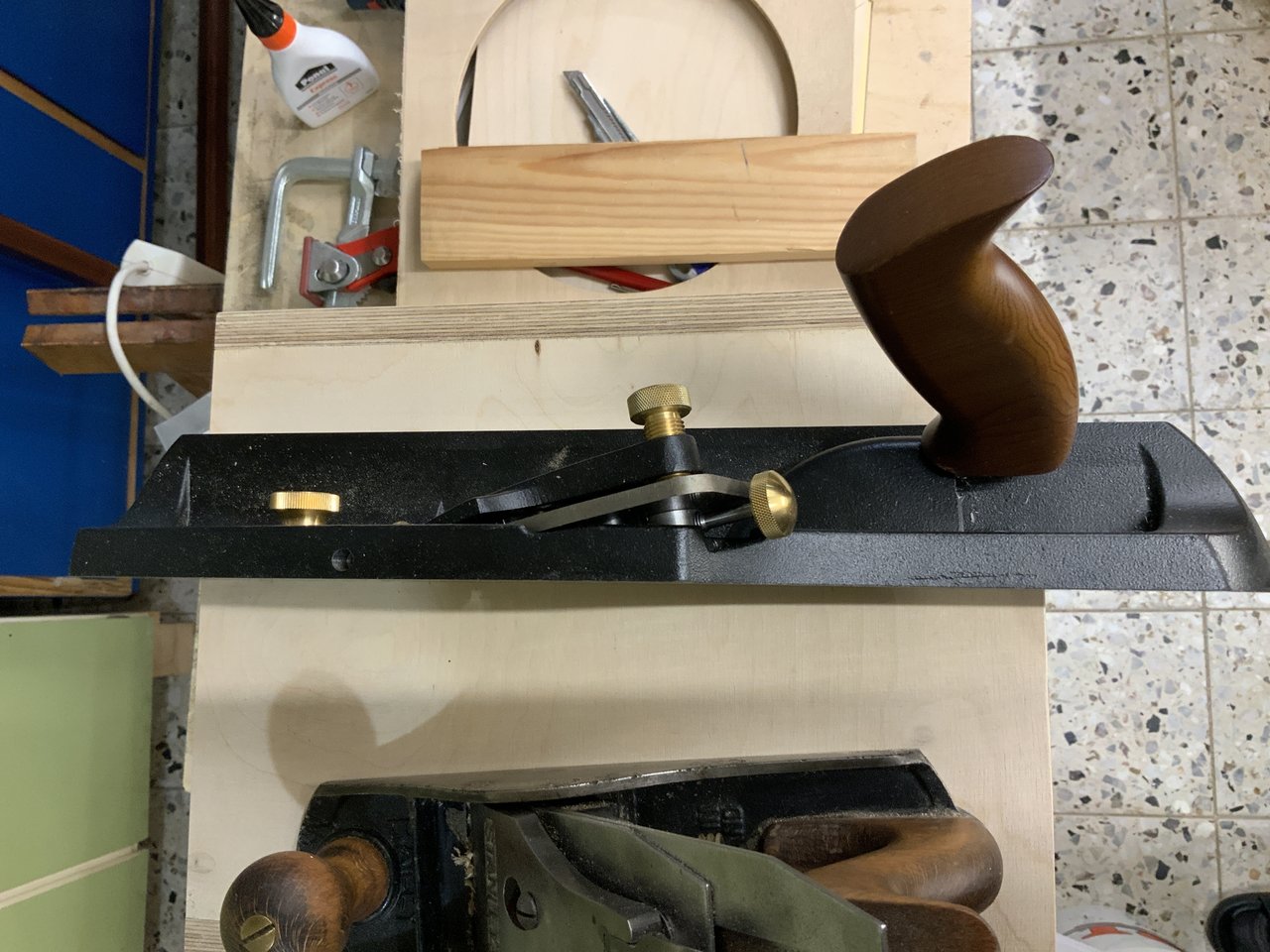 Das sind zwei No4 von Stanley, die sind wohl deutlich älter als ich, die waren aus der Bucht, einer aus England, kostet nicht viel, muss man aber unter Umständen aufarbeiten. Möglichst Exemplare ohne Rost kaufen. Die Eisen moderner Nielsen oder Veritas PV11, oder wie die heißen, die bleiben länger scharf, aber die Stanleys haben ja Schnellverschlüsse, Eisen raus, abziehen, weiter geht es. Wenn man umstellt auf Handwerkzeug, und öfter rechte Winkel braucht, dann ist sowas hier eine Riesenerleichterung: Ein Bestoßhobel.