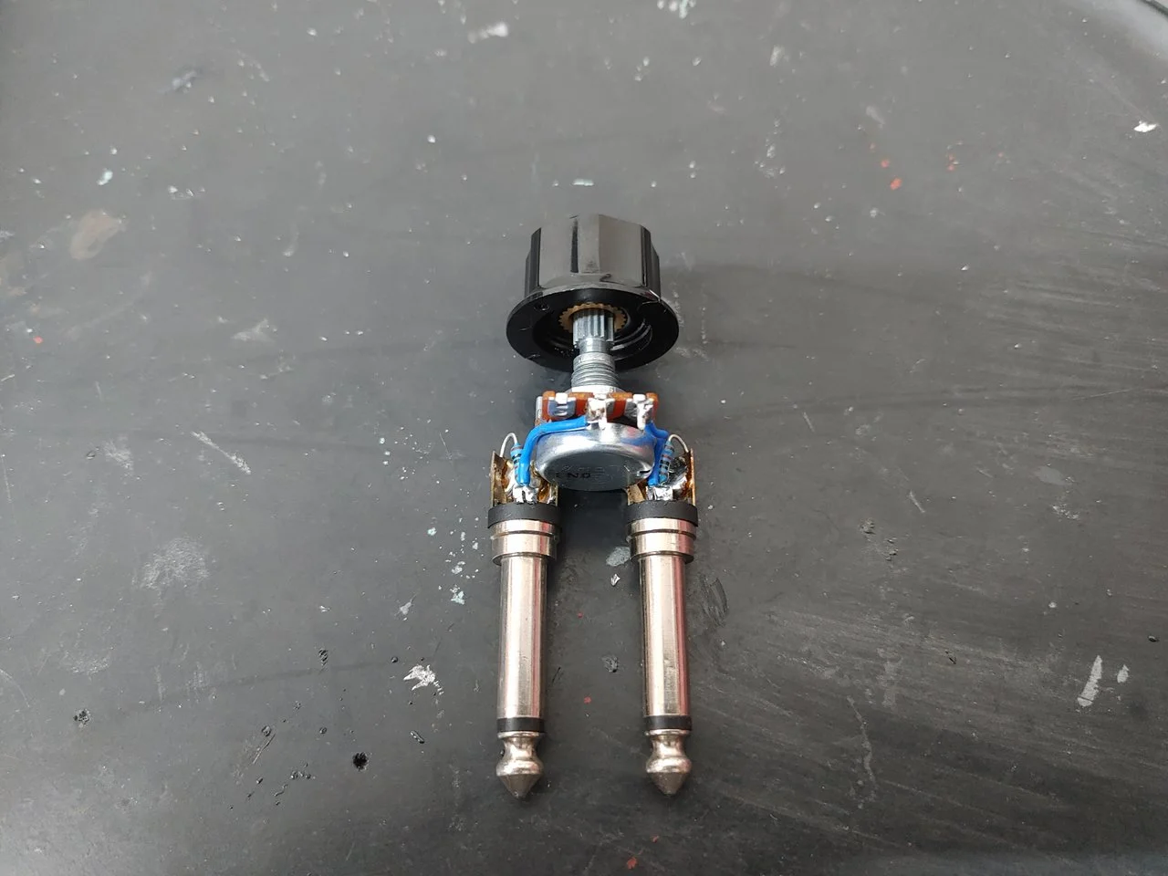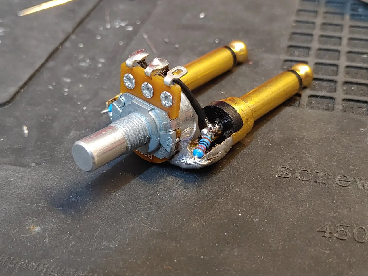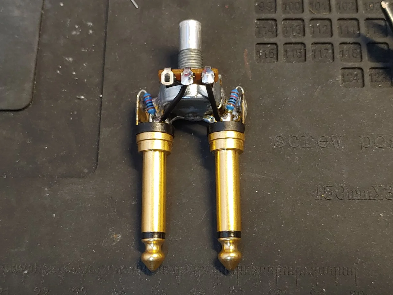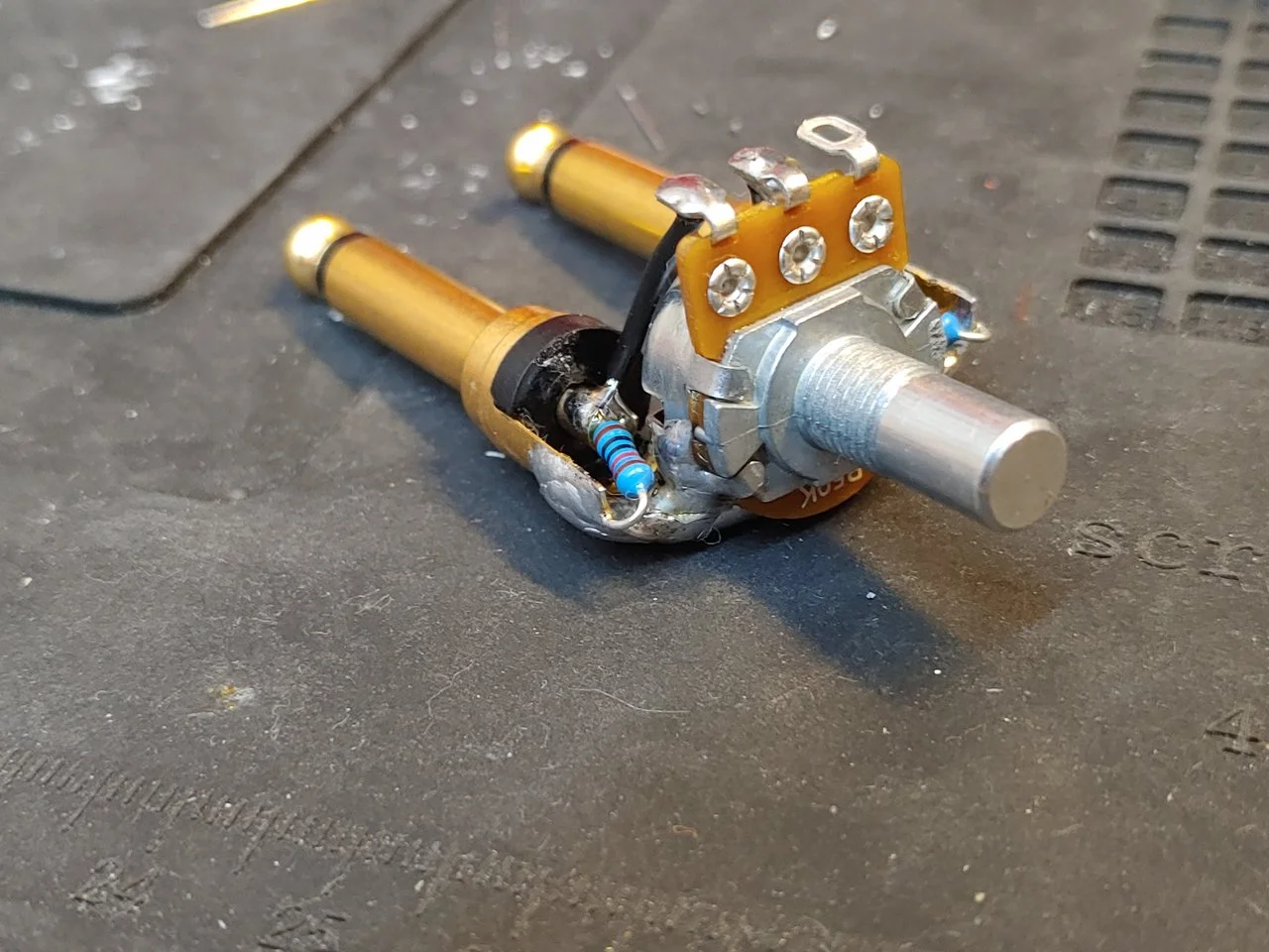 Die Bilder zeigen meinen ersten Versuch mit einem alten gerasterten Bourns Poti mit etwas längerer Achse aus meinem Fundus. Man erkennt die 10k Widerstände links und rechts für das Pi-Glied, das gerasterte Poti stellt den mittleren Widerstand dar und stellt die Dämpfung ein. Masse geht dann über die Potikappe. Ordentlich angelötet in korrektem Abstand und parallel für die Send und Return Buchse. Anschließend Heißkleber. Bilder von der Variante die in Nutzung ist hab ich gerade keine.