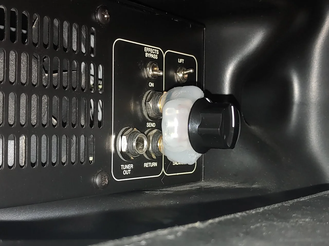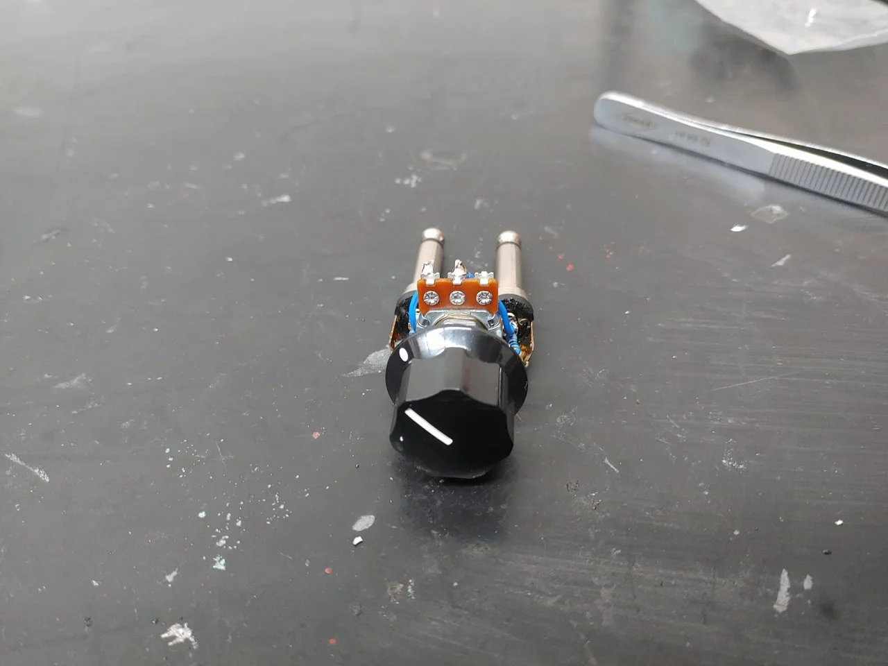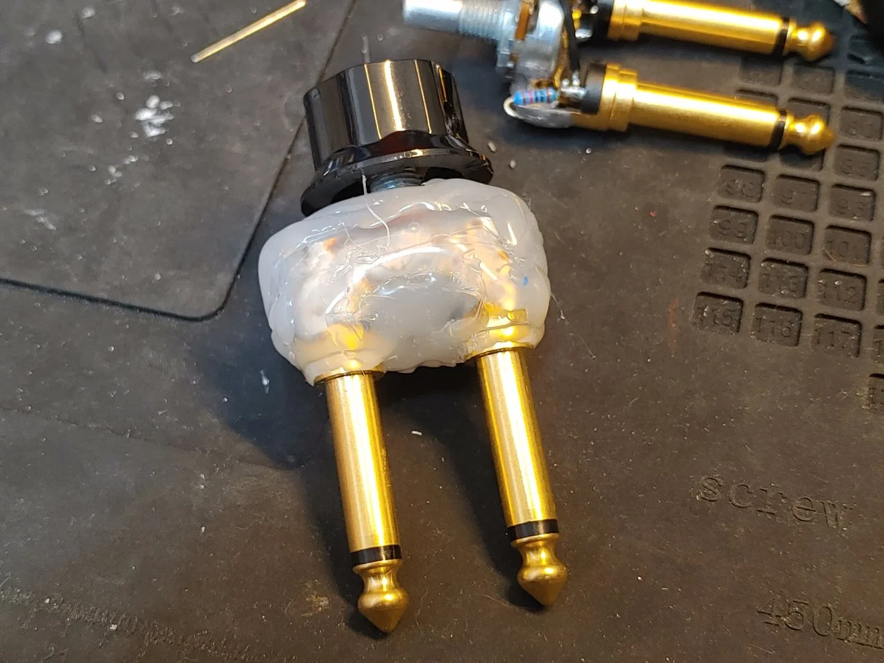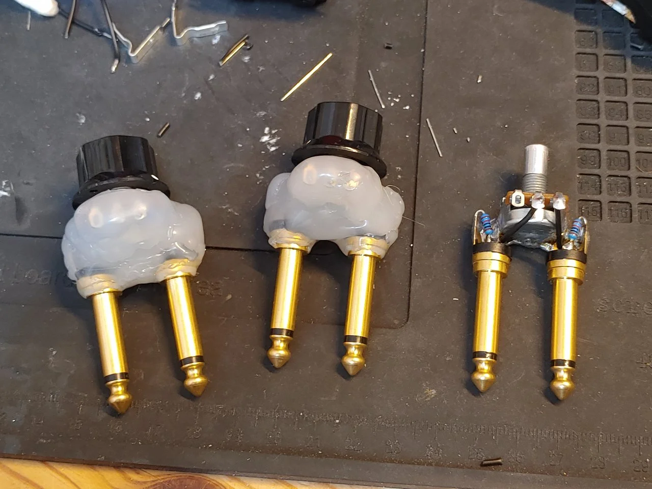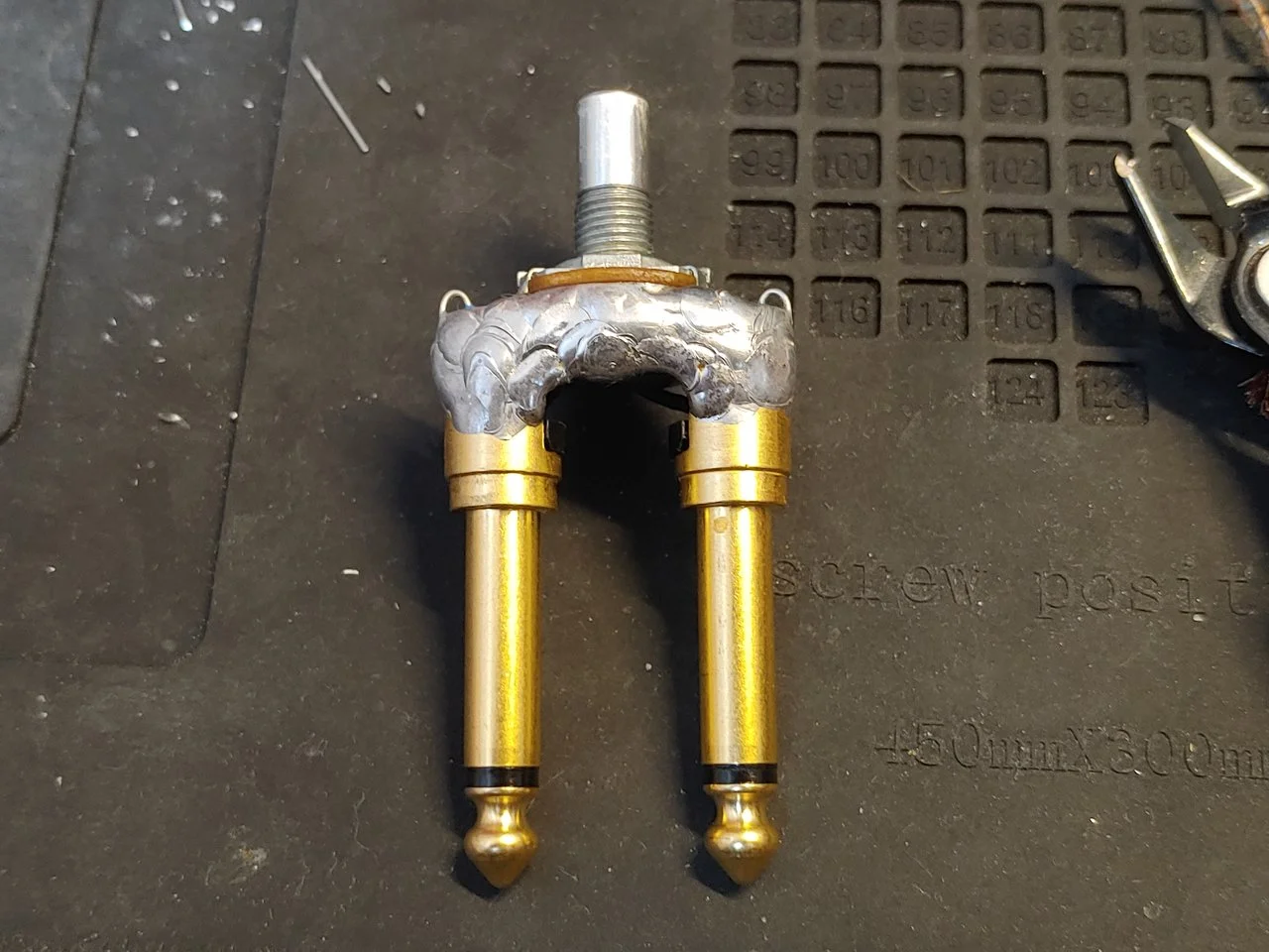 Die Bilder zeigen meinen ersten Versuch mit einem alten gerasterten Bourns Poti mit etwas längerer Achse aus meinem Fundus. Man erkennt die 10k Widerstände links und rechts für das Pi-Glied, das gerasterte Poti stellt den mittleren Widerstand dar und stellt die Dämpfung ein. Masse geht dann über die Potikappe. Ordentlich angelötet in korrektem Abstand und parallel für die Send und Return Buchse. Anschließend Heißkleber. Bilder von der Variante die in Nutzung ist hab ich gerade keine.