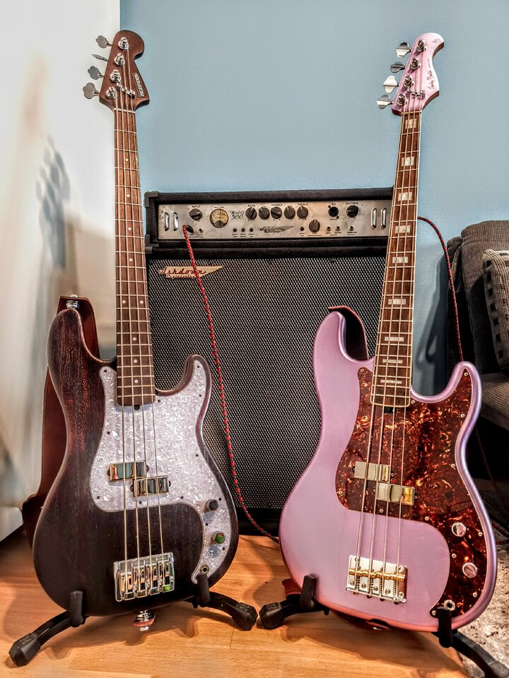 Der obere ist mit einer anderen Brücke modifiziert worden. Schaller mit Einzel-Piezos unter den Reitern. Stereo Bass.