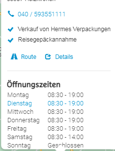 Ich beschließe, nun nochmal zu, Hermes Shop zu fahren. Ein Check auf der Hermes-Shop Seite zeigt mir, ja, der Shop hat heute durchgehend bis 19 Uhr geöffnet.