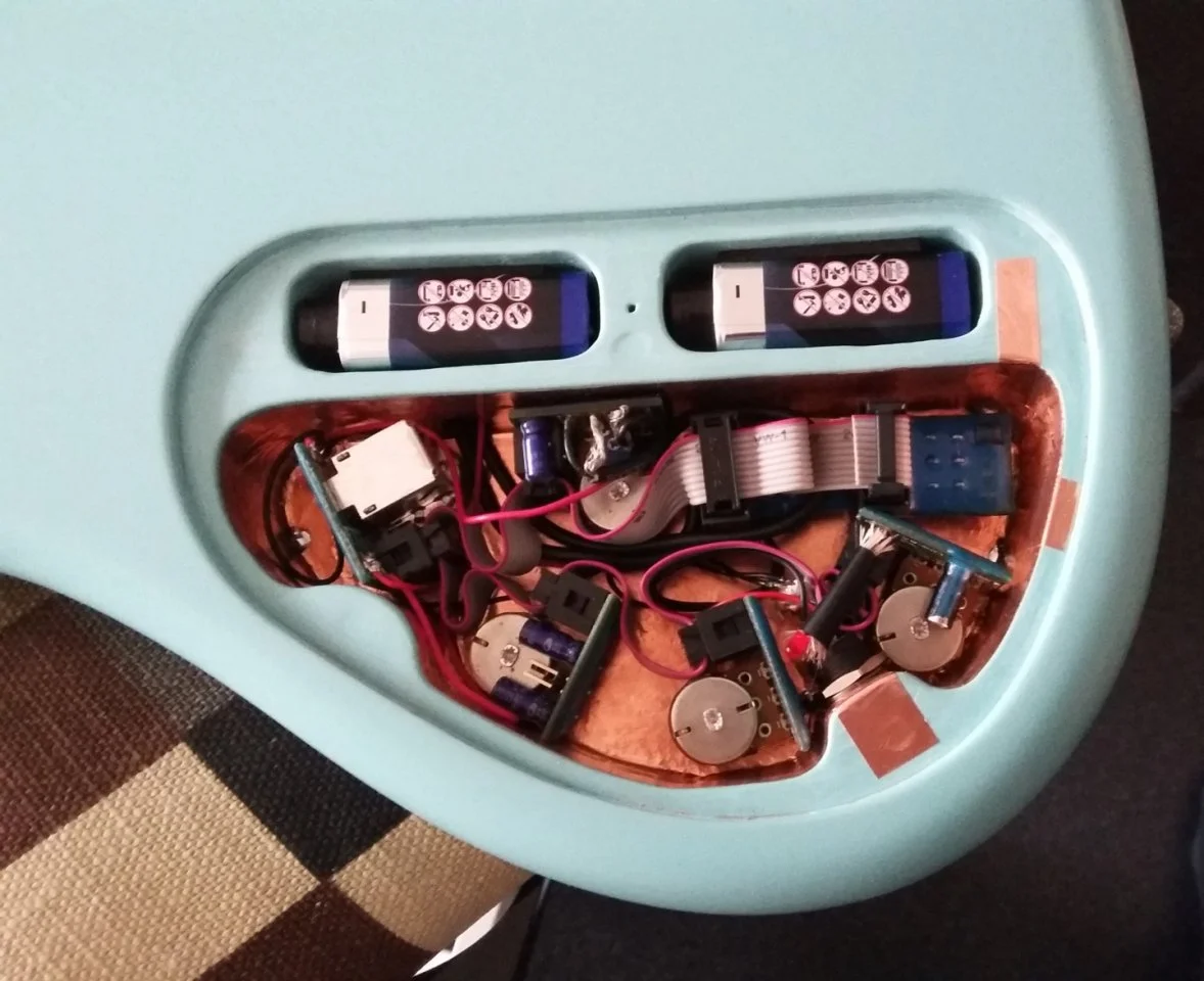 Der Abdeckung des Elektronikfaches wird magnetisch gehalten. Durch das Entfallen der Schraubverbindung wird ein schneller und werkzeugloser Austausch der beiden 9V Batterien ermöglicht. Zudem wird so eine homogenere Optik der Rückseite des Instruments erreicht. Aufklappen lässt sich die Abdeckung durch leichten Druck im Bereich der oberen Außenkante.