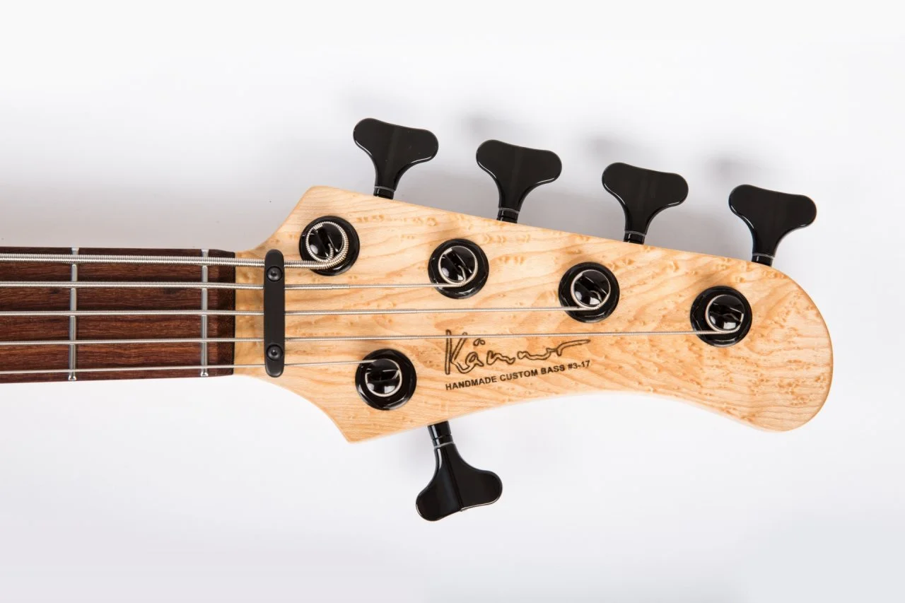 Hals. Der geschraubte Hals mit zurückversetzter Kopfplatte besteht aus Vogelaugenahorn. Das "Modern C" Halsprofil ist exakt einem dem des Auftraggebers gut in der Hand liegendem Halses nachempfunden. Verstärkt wird der Hals durch zwei eingeklebte Carbonrods (10x4mm). Zur Justage der Halskrümmung dient ein Dual-Action MM-Style Trussrod mit korpusseitigem Einstellrad.