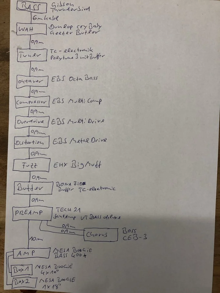 Was Talisker zum Beispiel anspricht, das Wah hinter die Zerre zu packen, ist genau solch ein Beispiel. Es klingt grundlegend unterschiedlich, ob ich ein cleanes, Wahsignal danach anzerre, oder ob ich ein bereits verzerrtes Signal mit dem Wah bearbeite - ersteres hat deutlich mehr Biss, letzteres klingt eher wollig/schwammig. Beides ist erlaubt und wird - je nach Mukke - auch genau so praktiziert.