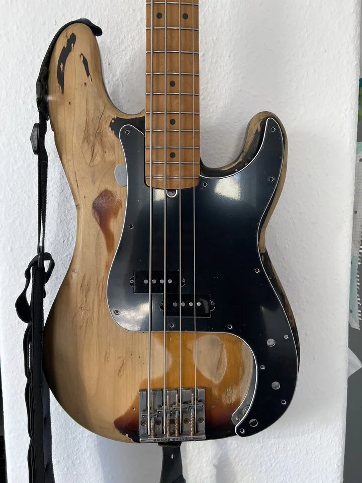 Der ganze Bass wurde nach dem Vorbild vom Adam Clayton Bass professionell geaged. Sieht echt authentisch aus . Und klingt hervorragend… Bin nur am Überlegen ob mir das mit dem geteilten Pickguard auf Dauer so gefällt …