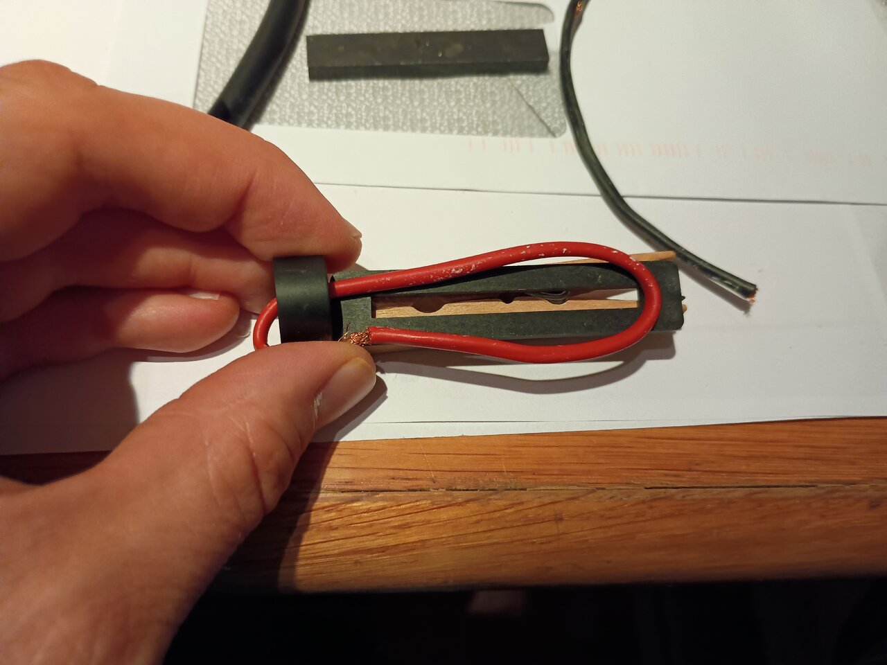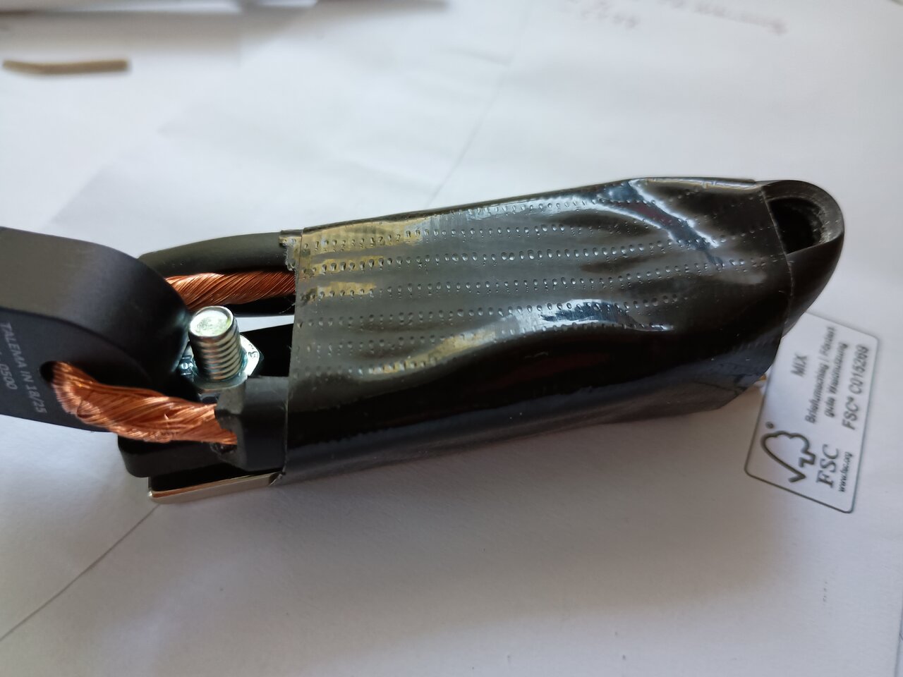 Der "Goldfoil" hat einen Neodym-Magnet und die Kappe braucht nur noch ein paar Schichten Klarlack. Sie ist aus eckigen Schaschlikspießen für das Gitter und aus einem Rest Birnenholz vom Korpus, mit draufgepinseltem Acryllack. Dazu ein bißchen Papier aus der Weihnachtsdeko-Schublade, voilà: