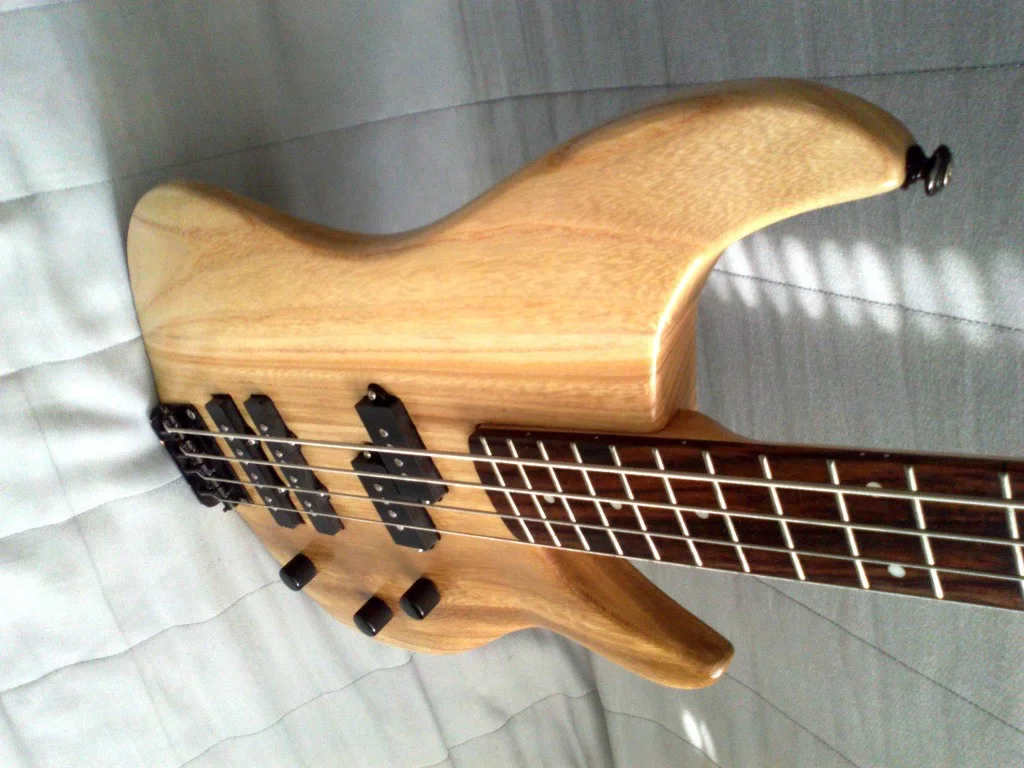Der Korpus meines Frankensteins ist von einem alten Matsumoku-Body (Diamond by Aria). Aus der Ecke habe ich in letzter Zeit 2 weitere ebenfalls von dort stammende Bässe (Mad Axe by Aria) in Ebay Kleinanzeigen gesehen, die den selben Body zu haben scheinen.