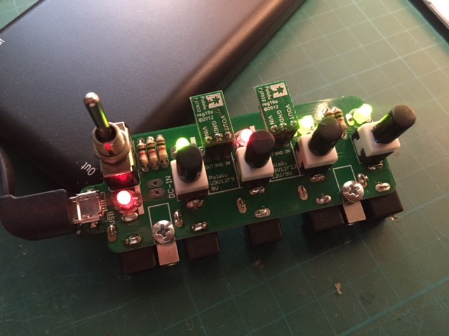 Der Kipper ist ON/OFF, die 4 Drücker sind für den Spannungswechsel. Die LEDs sind zweifarbig um die eingestellte Spannung anzuzeigen.