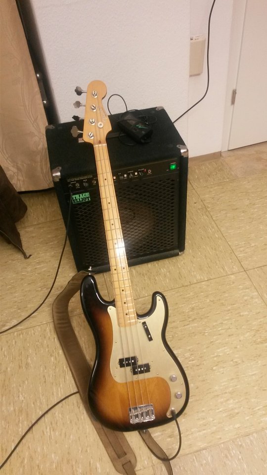 Squier Hals mit Rosewood Griffbrett, der eigentlich für diesen Bass gedacht war. Aber der passte - ich wenn ich vorher gemessen hatte - knapp nicht in die Halstasche. Der ist jetzt auf meinem weißen PJ gelandet. Kleiner Hals-Walk-Around eben.