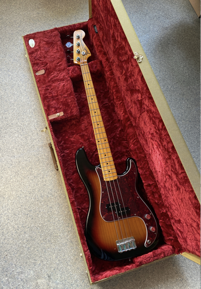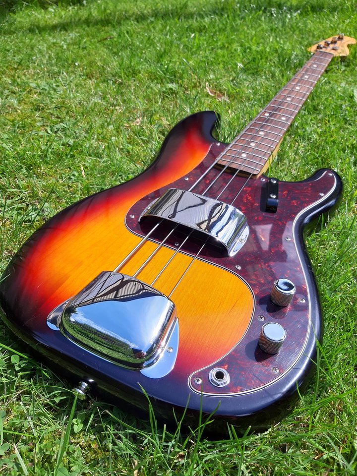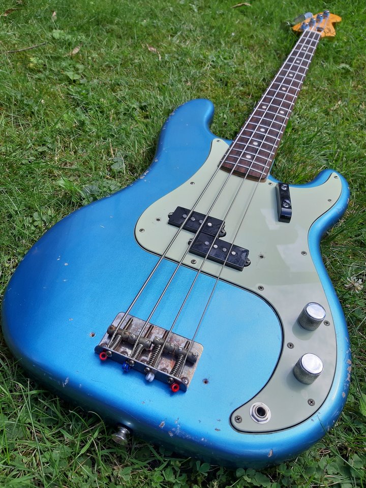 Gemäß der Absprache und seinen Vorstellungen, hab ich ihm eine Replik eines 1973er Precis gebaut (Löcher für die Tugbar und die Chromcover gibt es natürlich, aber er wollte sie nicht montiert haben) und ich kann nur sagen, dass sie nicht nur eine Schönheit ist, sondern auch am Amp richtig geil klingt. Verbaut ist ein SD Steve Harris PU, den ich nie auf dem Schirm hatte, aber der sicher in Zukunft bei mir auf der Liste stehen wird. Growl für Tage!
