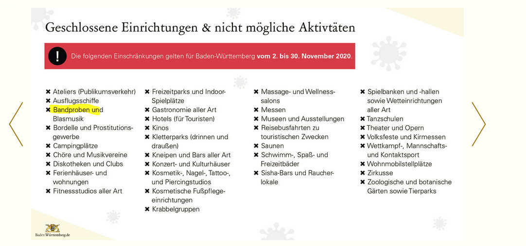 In BW ist doch immer alles extremer als sonst wo. War schon beim ersten Lockdown so.In BW sind Bandproben expliziet unter "Verboten" aufgelistet. Gleiches wie für Mannschaftstraining etc...