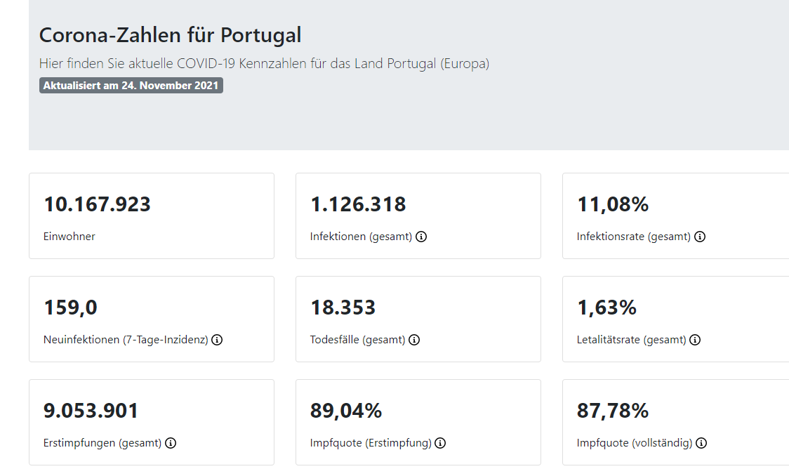 Na ja ... wenn wir die absoluten Zahlen mal für Bevölkerungszahl in Deutschland (=83,2 Mio.) umrechnen bzw. jeweils mal 8 nehmen, sehen die portugiesischen Zahlen auch nicht mehr ganz so toll aus. Dann würde es nämlich in Deutschland jetzt schon 150.000 (statt aktuell 100.000) Todesfälle geben. Dass es die in Deutschland trotz niedrigerer Impfrate nicht gibt, liegt vermutlich an den wesentlich besseren medizinischen bzw. ITV Kapazitäten. Hoffen wir mal dass die kürzlich gestiegenen Impfraten jetzt auch anhalten und wir alle schnell geboostert werden und jetzt endlich auch die Kids bis runter zu 6 Jahren geimpft werden.