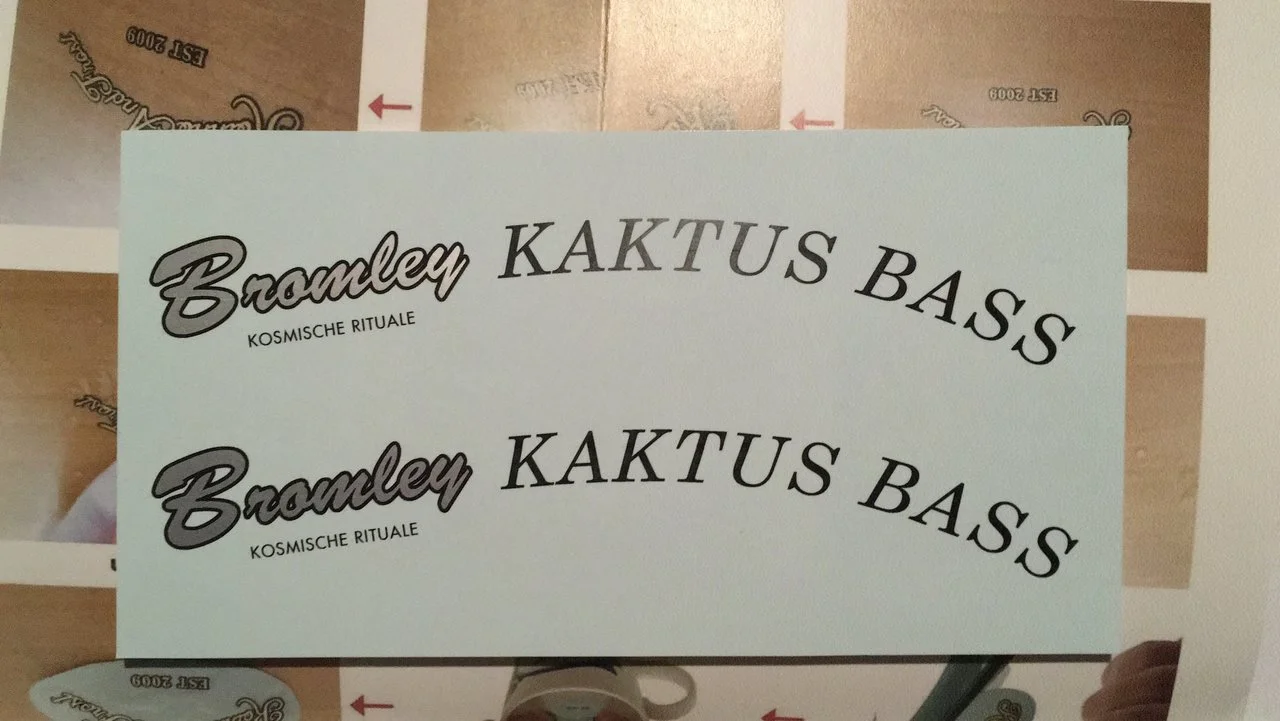 Der Aufkleber setzt wie folgt zusammen: Bromley für den Namen des Erbauers, Kosmische Rituale für das erste Album, an dem ich mitgewirkt hatte und Kaktus Bass als Anspielung auf meinen Spitznamen (Jau, diese Selbstverliebtheit