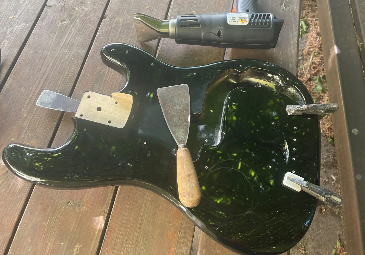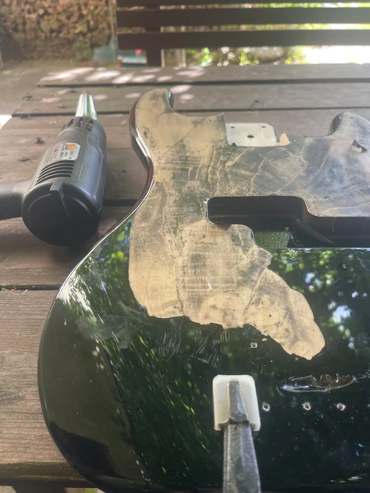 Die alte Farbe ging mit der Heißluftpistole schon mal relativ gut ab. Als Nächstes muss ich mir überlegen, wo die Löcher hin sollen.