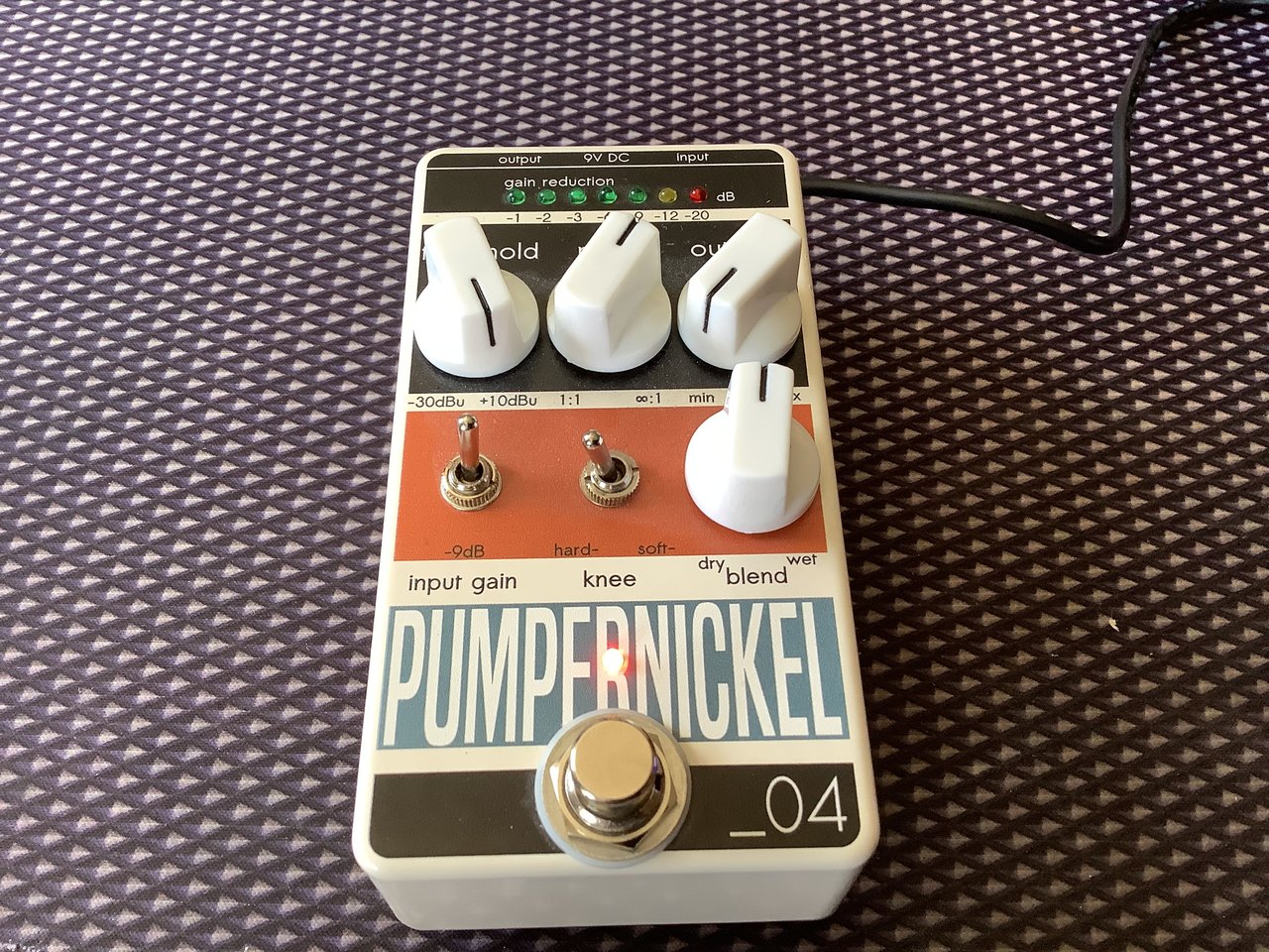 Der Pumpernickel ist ein dbx160a orientierter Kompressor, optimiert für Bass Spieler. Basierend auf dem THAT4301 arbeitet der Kompressor intern mit 18V, wird jedoch mit einem normalen 9V Netzteil betrieben...