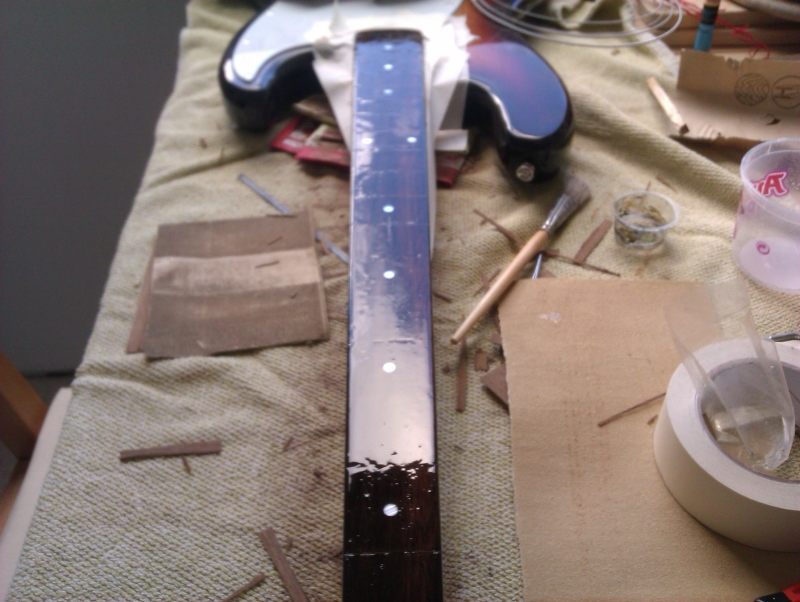 Danke für eure Antworten. Ich denke, ich versuch das mal. Ich hab hier einen Bastelbass, an dem der Hals eh durch unfachmännisches Lackieren verhunzt ist. Vielleicht klappts ja. Der Korpus des Bass ist blau und wenn ich die Lücken mit blauem Epox-Harz fülle sieht das bestimmt gut aus (wenn ich das ohne kleckern hinbekomme).