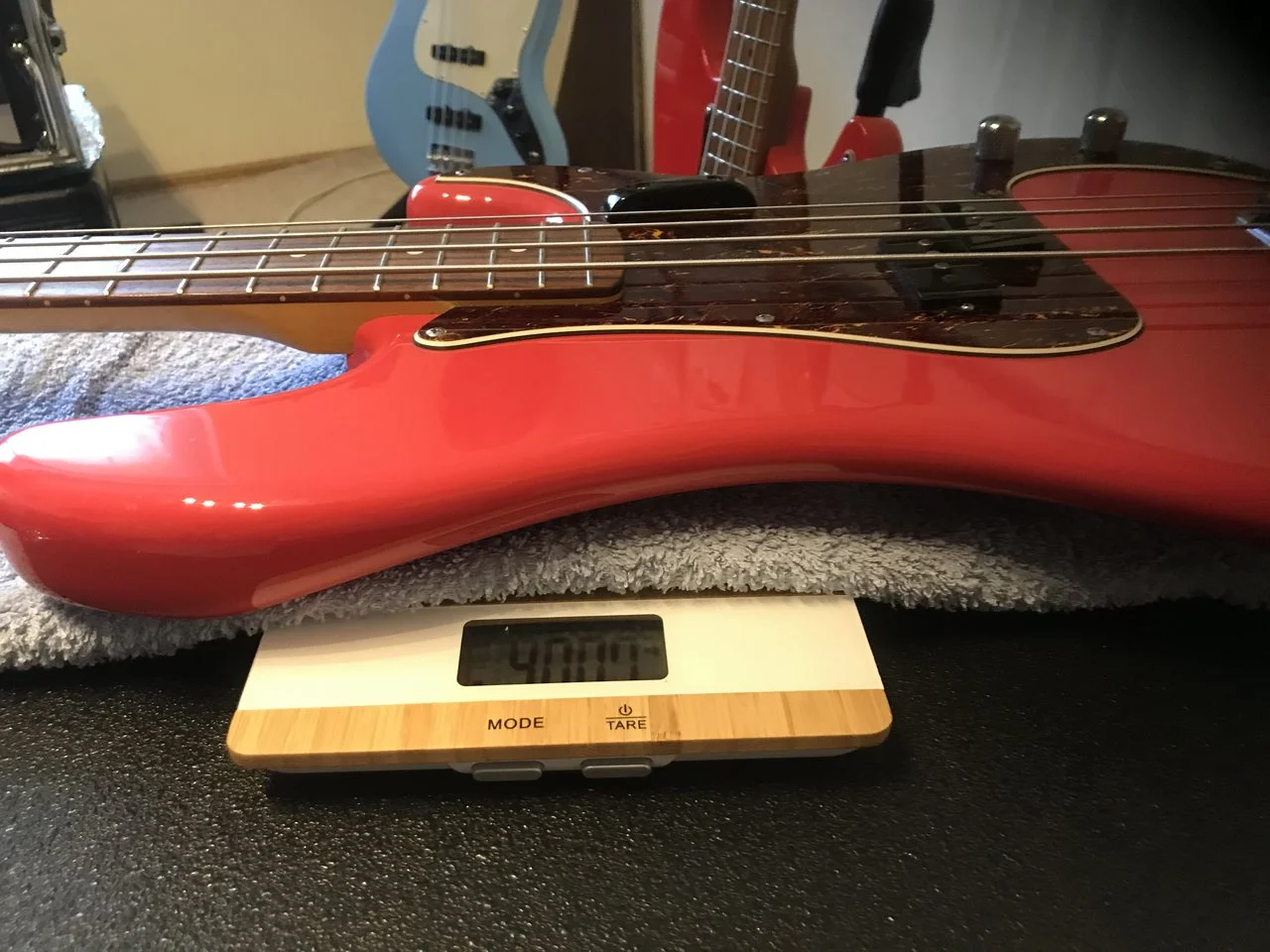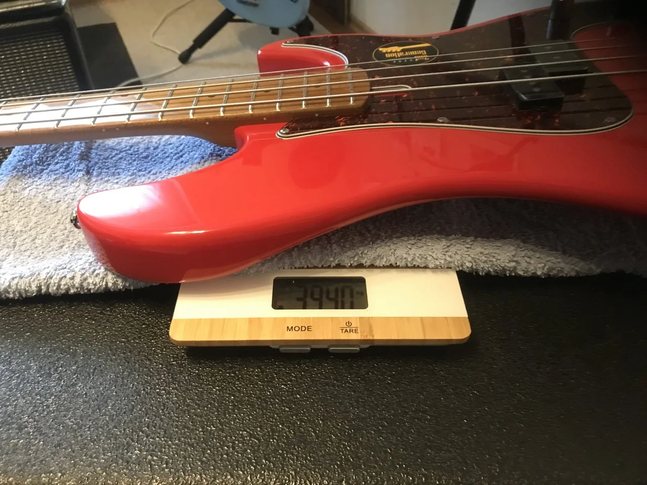 Beim Legen des Basses auf die Haushaltswaage zeigt sich dann der Schwerpunkt beim Sire einiges näher an der Halsseite als beim Squier CV, der seine Waage gut hält, wenn er auf der Neckplate aufliegt: