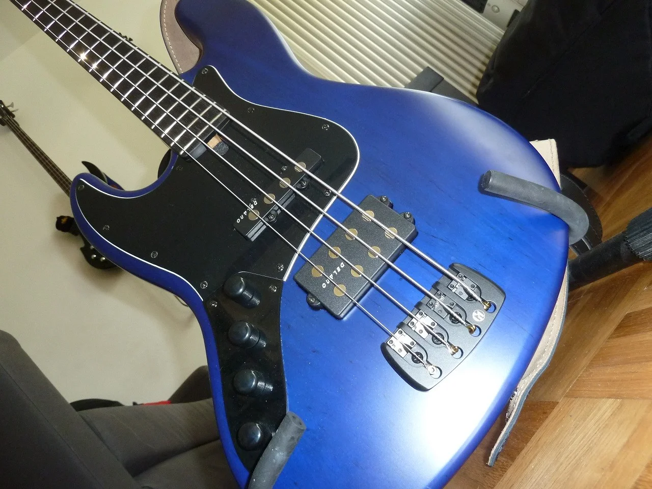 Der Hals ist aus Ahorn und das Fingerboard aus schönem dunlem Ebenholz. Bestehend aus 21 Bünden plus Null Bund. Die Mechaniken sind schwarz Matt, wie auch die Brücke. Die PUs sind erste Sahne !! Einmal einen Delano Single Coil und ein Delano Humbucker, gepaart mit der Glockenklang 2 Band Aktiv-Elektronik mit Aktiv/Passiv Switch und Tone Blend. Der Korpus ist aus Erle. Blau lackiert mit Schwarzem Pickguard. Schlicht, aber mir gefällts. Jetzt zum wesentlichem...
