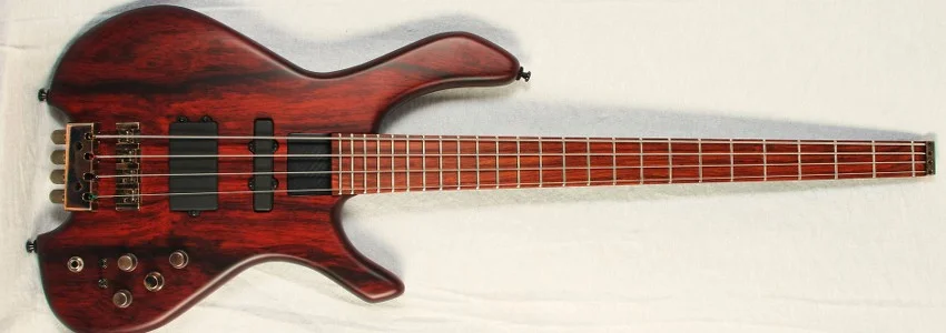 Aufgrund meiner starken Holzaffinität war Bogart Bass eigentlich auch nichts für mich (nähere Infos zur konstruktiven Besonderheit dieser Instrumente auf www.bogart-bass.de). Allerdings haben mich die Korpusform und die Halsmasse des Slim-Fast-Halses sehr angesprochen. Ausschlaggebend für meine Entscheidung war dann, dass ich im Gespräch mit Stefan Heß (Bogart-Bass) gemerkt habe, dass dieser a) ein supernetter Typ und b) bereit ist, für mich auch etwas auszuprobieren, was er bisher noch nie gemacht hat, nämlich seinen „Kunststoff“-Bässen ein Echtholzfurnier zu verpassen. Mir hat gefallen, dass er sich auf meine Wünsche einließ und mich als Kunden gewinnen wollte, obwohl es für ihn völliges Neuland war. Das nenne ich Hingabe. Ich würde mich eher als schwierigen und anspruchsvollen Kunden bezeichnen dem es auf das Detail ankommt. Damit ist Stefan immer souverän umgegagen. Er hat dann etliche Monate rum experimentiert und mir irgendwann mitgeteilt, dass er jetzt so weit ist. Dann wurden die Details besprochen und los ging der Bau meines Traumbasses. Beim Holz fiel die Wahl dann auf Cocobolo, jeweils für Bodys und Griffbrett. Wie umwerfend das aussieht, könnt ihr den Bildern entnehmen. Die Headlessausführung hatte er sowieso im Angebot. Nachdem mir die Kopfplatten der Bogart-Bässe einfach nicht gefallen und ich bereits in den 1980er Jahre eine Rockinger Headless Fretless Bass spielte, ich also mit der Optik keinerlei Probleme habe, fiel die Entscheidung nicht schwer. Die Fertigung hat nur 6 Wochen gedauert. Ich würde mich ja eher zu den schwierigeren Kunden zählen der relativ viel nachfragt und dem noch dies und dass einfällt. Stefan hat das nie angenervt.
