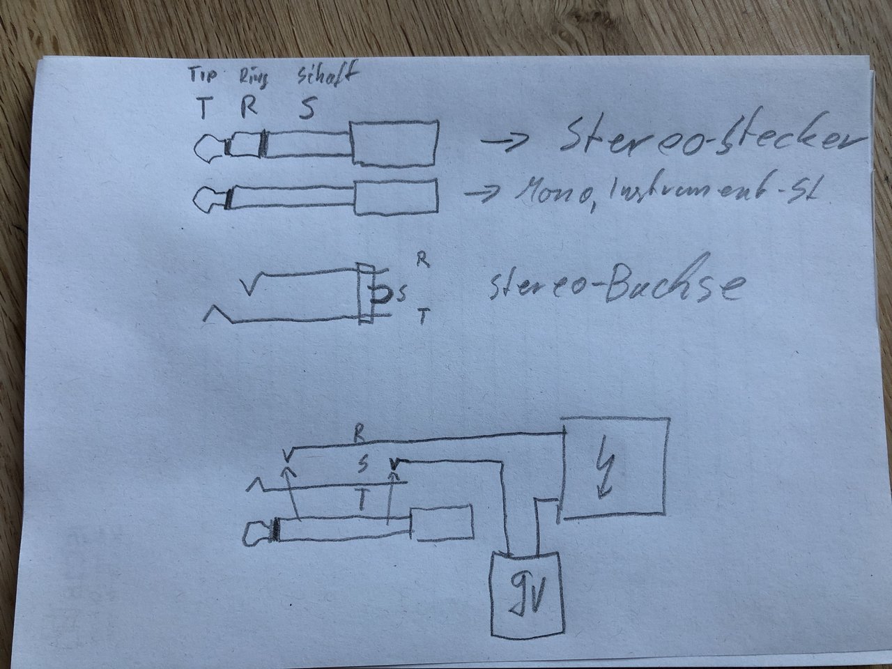 es besteht also nicht die Möglichkeit, dass irgendwas nicht geerdet ist? Ich habe das blaue Kabel ja an den Tip (hot), den geschlossenen Ring, also das kürzeste Stück gelötet, das schwarze Baterriekabel auf den Sleeve und das andere schwarze Kabel aus der Elektronik auf das lange Stück (Ground)...also Erdung. Diese Begriffe "Ring" und "Sleeve" verwirren irgendwie total.