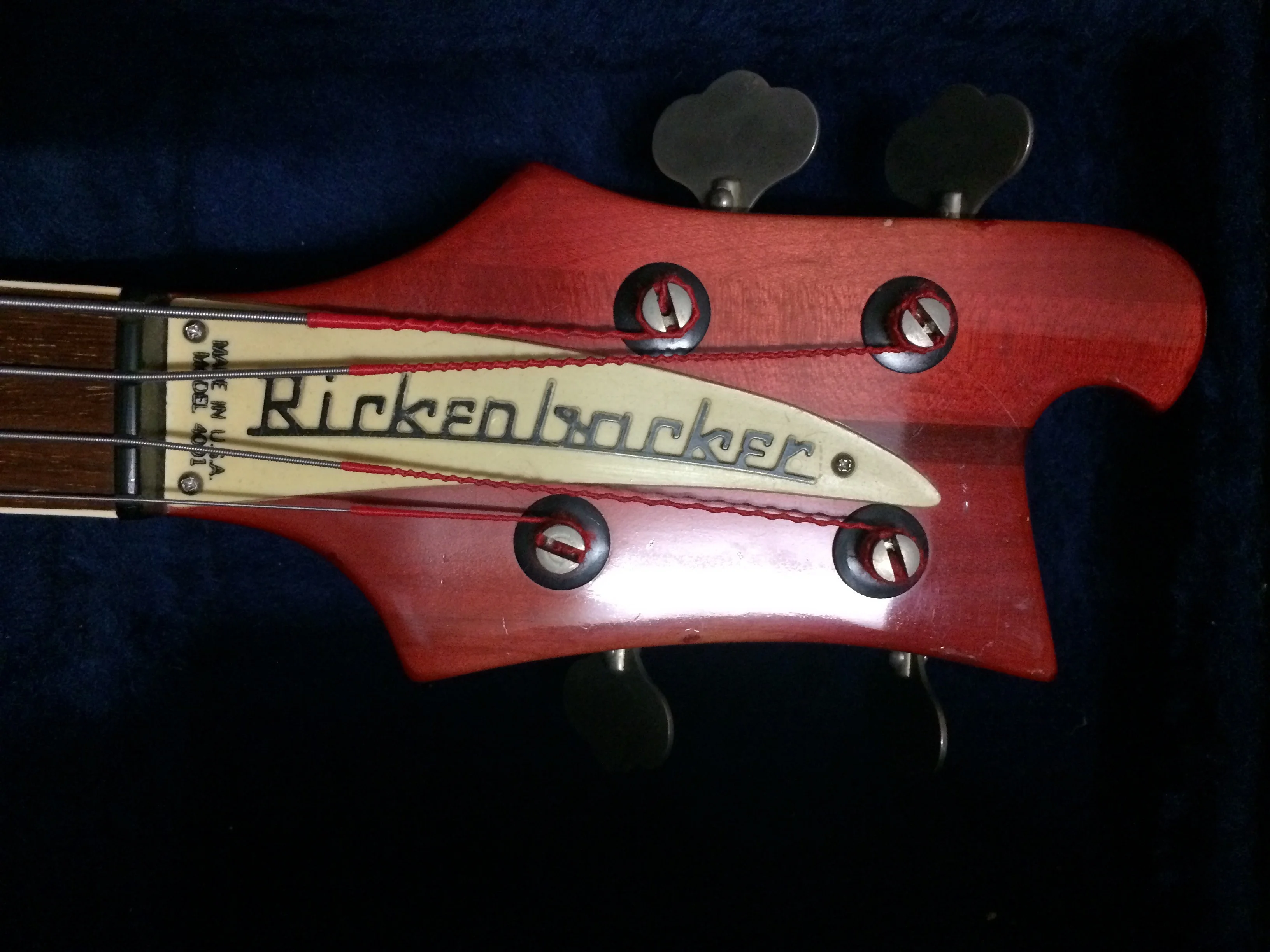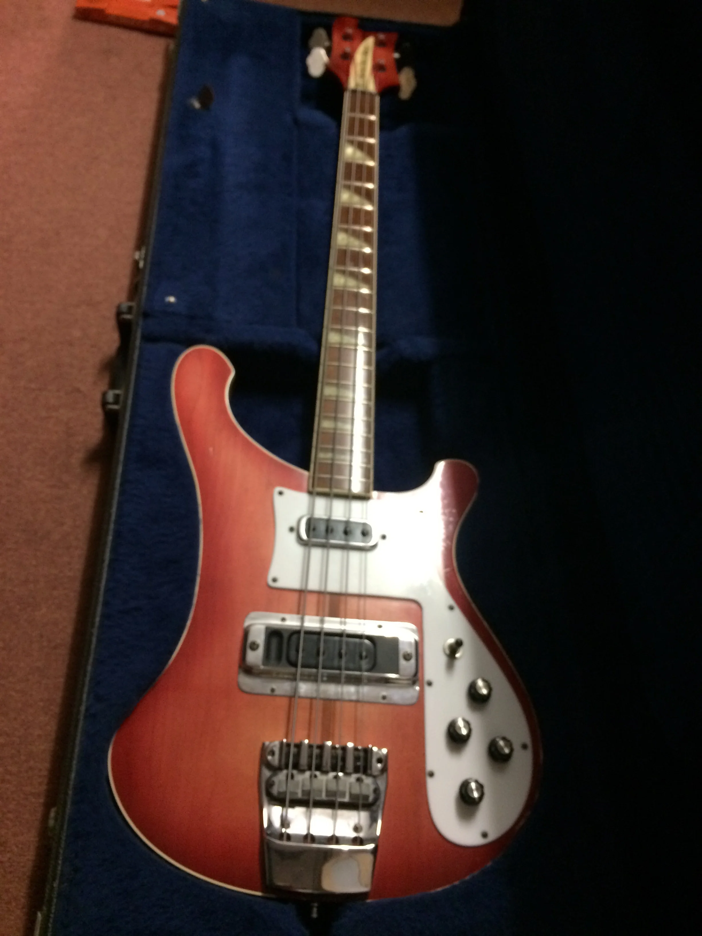 Den Bass habe ich wie folgt aufgewertet: Zuerst habe ich ihn nach Berlin zum „pleken“ gesendet, d.h. die Bünde wurden mittels Maschine perfekt abgerichtet und der Hals wurde perfekt eingestellt, dadurch hat der Bass eine hervoragende Saitenlage. Der Stegtonabnehmer hat nicht mehr die „Horseshoe“-Kappe, die wurde von dem Vorbesitzer in den 70ern entfernt, so wie das wohl jeder Rick-besitzer gemacht hat, dadurch entsteht Rickenbackertypisch ringsum den Pickup eine Öffnung, diese Öffnung habe ich mit einem sogenannten „Bretzel“ geschlossen.n Das weiteren hat der Bass einen Rick-Push-Pull-Poti erhalten, damit kann man wählen zwischen 70-er Ricksound oder modernem 4004 Ricksound. Obendrein wird der Bass mit einem passenden Werkzeug für die Halsjustage geliefert und ein Formkoffer aus den 70ern (Original???), der Koffer ist jedoch schon ein reichlich mitgenommen (siehe Fotos).