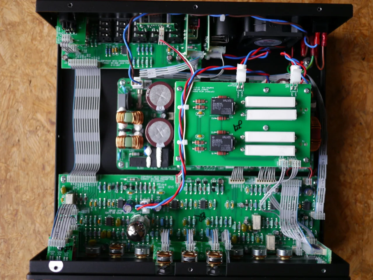 Hier ist ein Foto des Innenlebens des Trickfish, da sieht man schön die 2 zusätzlichen 6.800 µF Kondensatoren hinter der Pascal S Pro-2 Digitalendstufe.