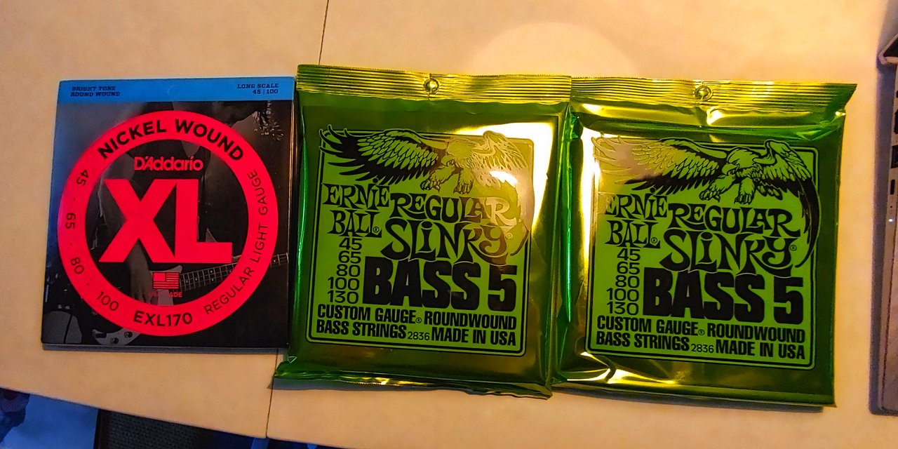 ich biete hier zwei Sätze Regular Slinky 5, 45-130 an und ein mal die D`Addario EXL 170.