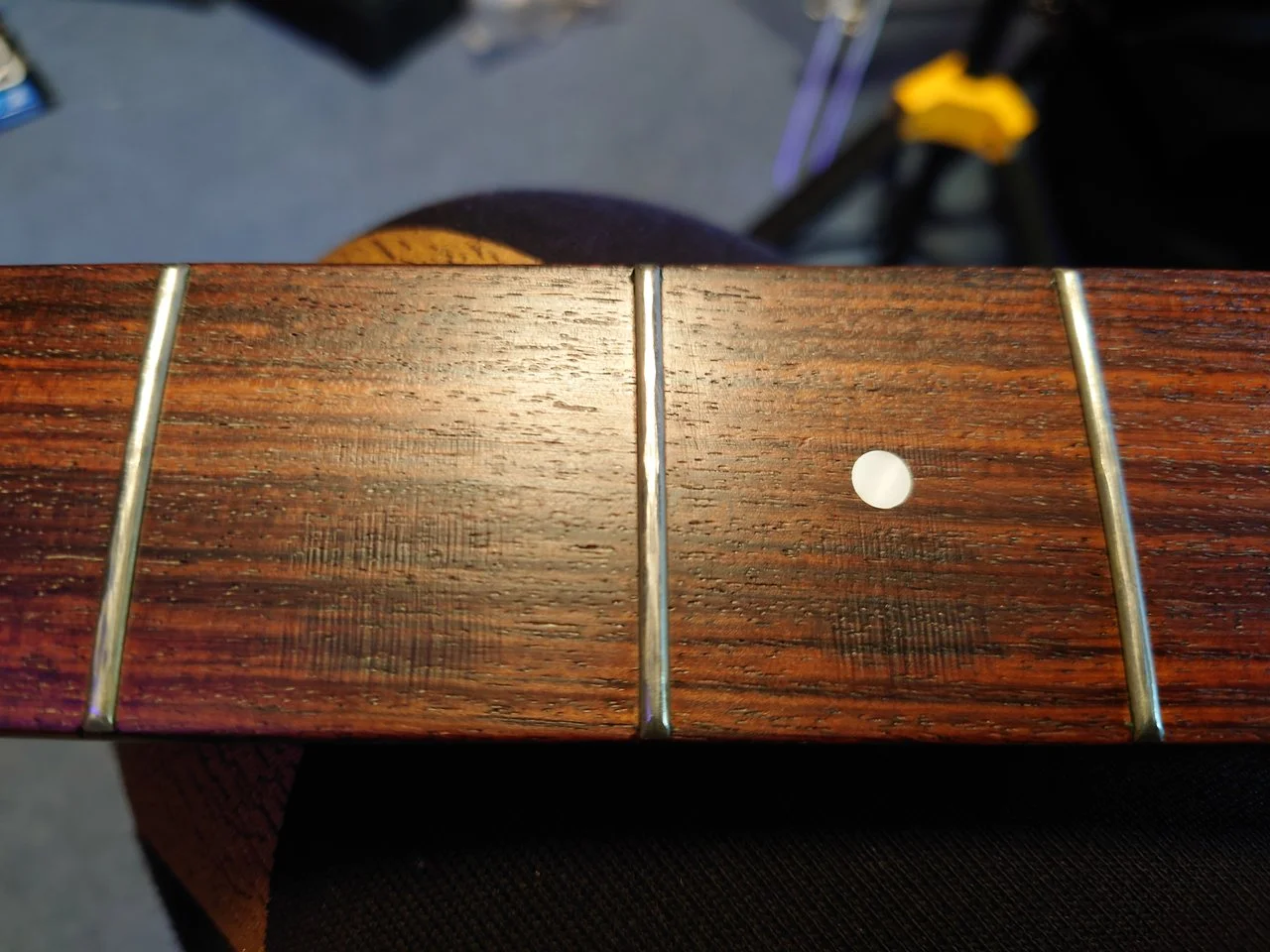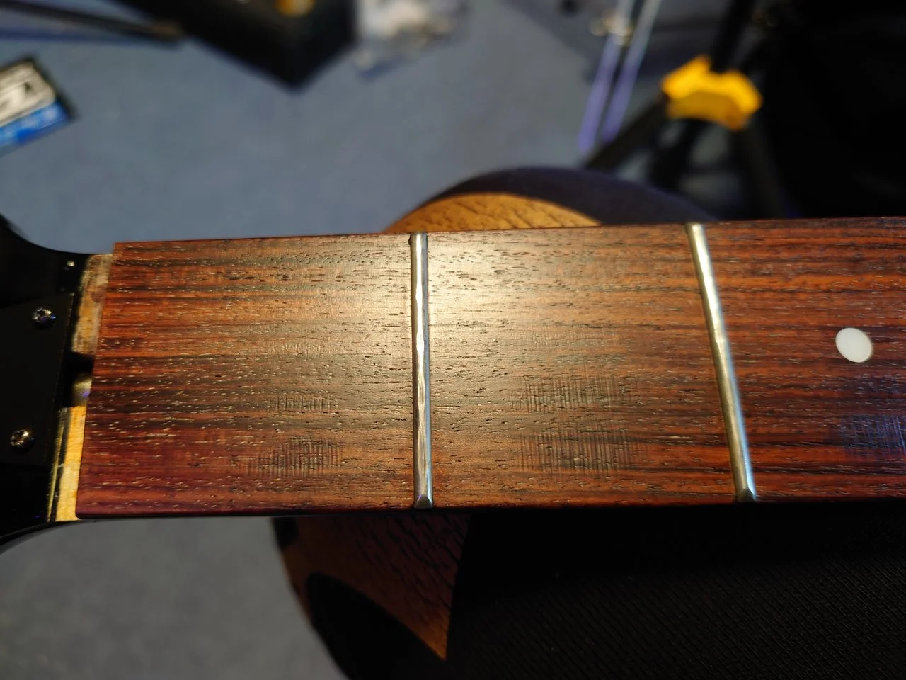 Auf dem Griffbrett haben sich in den ersten 5 Bünden kräftige Spüren der tieferen Saiten eingegraben. Ich hoffe man erkennt es auf den Bildern. Auch die Bundstäbe Nr. 1 bis 5 sehen schon nachgefeilt aus, viel Leben ist da nicht mehr drin. Somit meine Fragen an die Experten zur Sache: