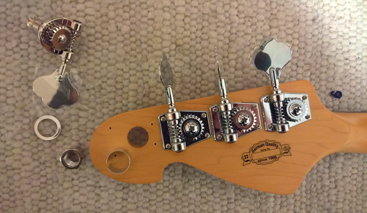 Die original Mechaniken haben ein 18mm Bohrloch, die leichten Alu Mechaniken benötigen jedoch nur 17mm