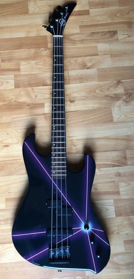"... mit zeitloser lila/weißer Laser Lackierung ..." –Schicker Bass, keine Ahnung, ob er das wert ist