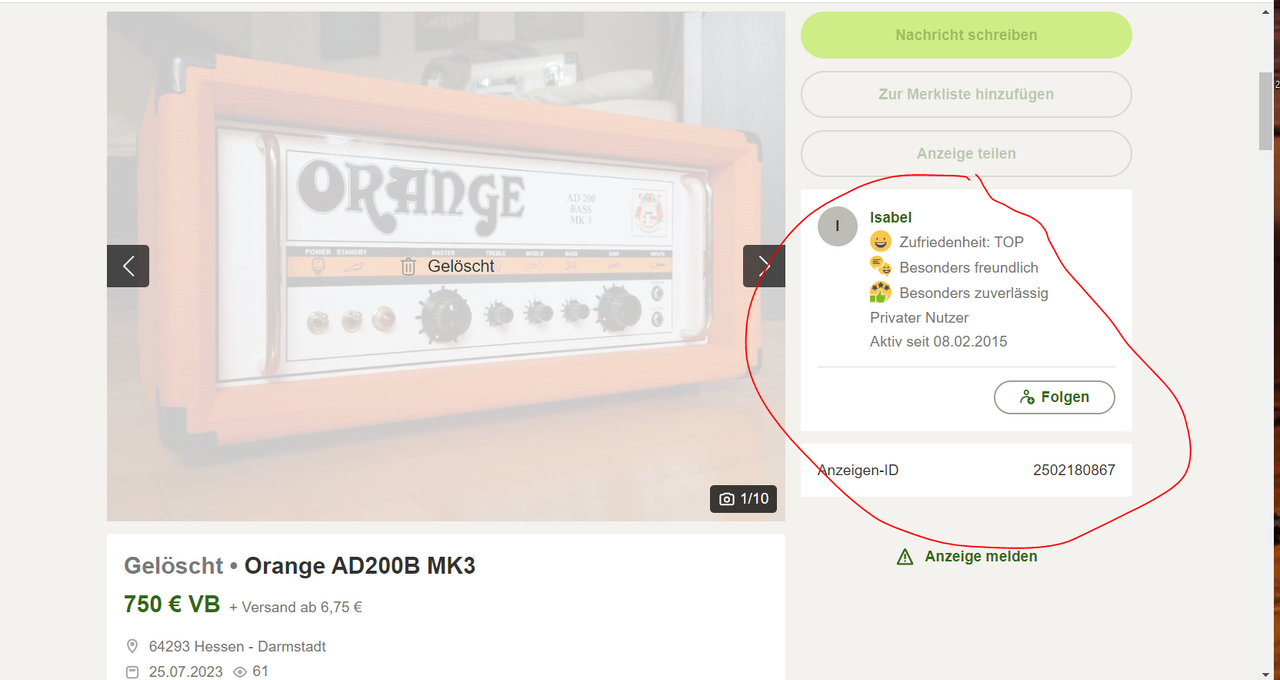am 25.07.2023 um 13:58 Uhr hattest du mit Isabel Kontakt zur Anzeige „Bassverstärker Orange AD200B MK3“ (Anzeigennummer 2502408845).