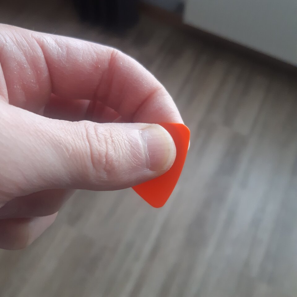 Habe ich auch schon versucht. Am Ende habe ich das Plek sogar per Druck durch den Daumen leicht in sich gebogen gehalten, damit es mir nicht so leicht wegrutscht. Nützt auch nichts. Ich habe - offenbar im Gegensatz zu vielen anderen mit schwitzigen Händen - das Problem, dass meine Fingerspitzen zu trocken und glatt sind und mir das Plek dann wegrutscht. Da fehlt einfach der "Klebstoff" bzw. mehr Reibung. Deswegen experimentiere ich mit Doppelklebeband oder angetrockneter und klebriger Limo auf dem Plek.Ich hatte früher auch das Problem, dass das Plek bei Wechselschlag anfängt zu wandern. Hab mir dann angewöhnt das Plektrum zwischen Daumen, Zeige- und Mittelfinger zu halten, siehe Fotos: