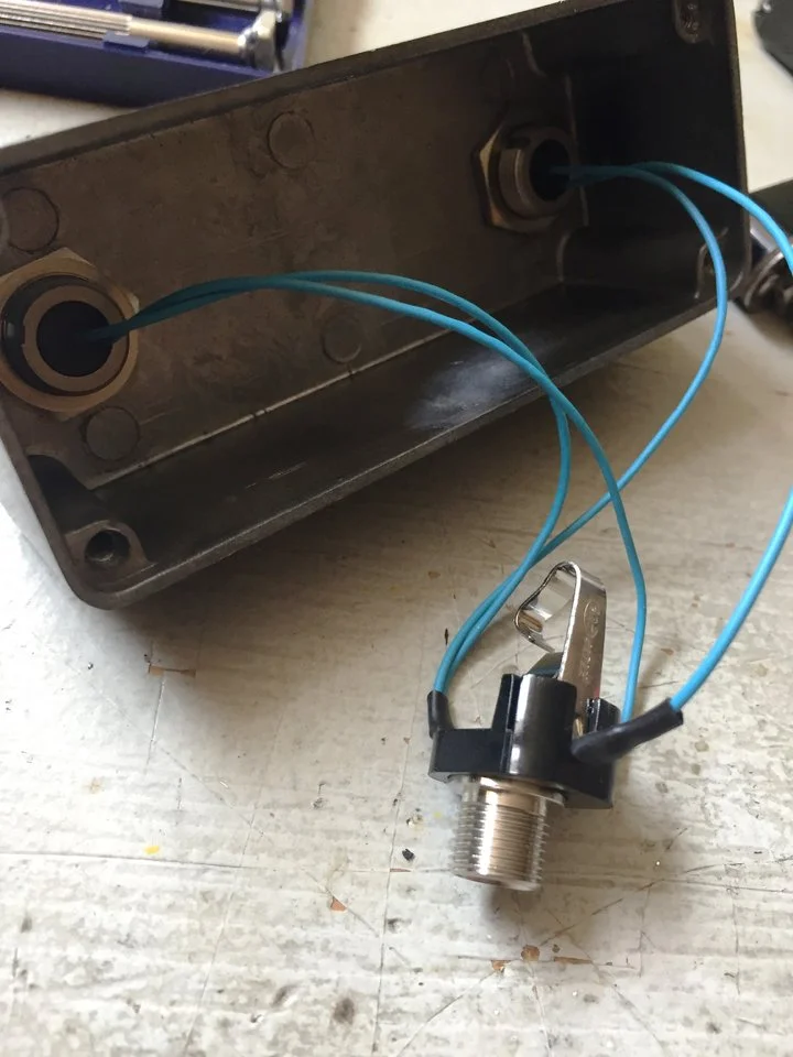 Neue Fußtaster einbauen und mit der Stereobuchse verlöten (FS1: Ring gegen Sleeve, FS2: Tip gegen Sleeve), den Schrumpfschlauch nicht vergessen.
