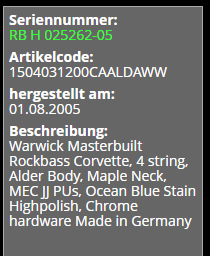 P.S.: das ist wohl auch gut, da vorsichtig zu sein: Wenn ich das, was ich auf dem Bild der Rückseite der Kopfplatte lesen kann, um das angebliche Baujahr ergänze, wirft Warwick tatsächlich das folgende aus: