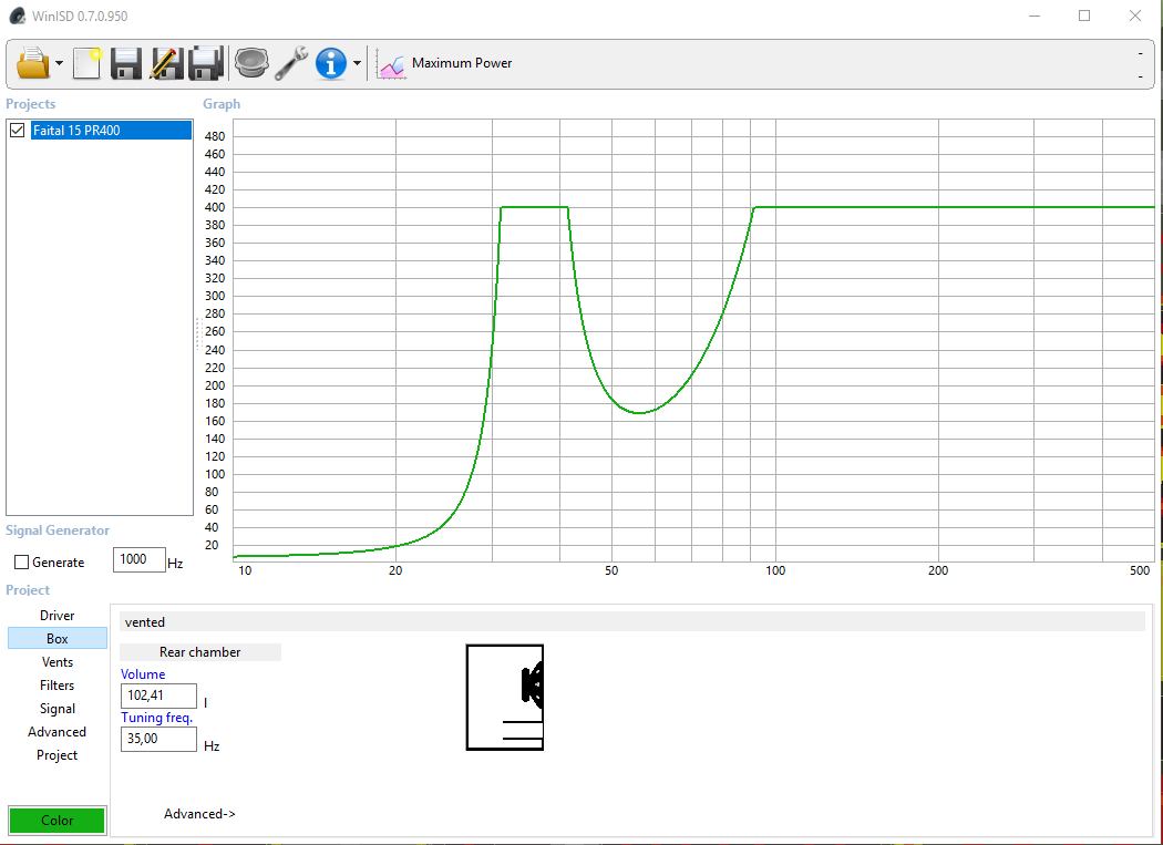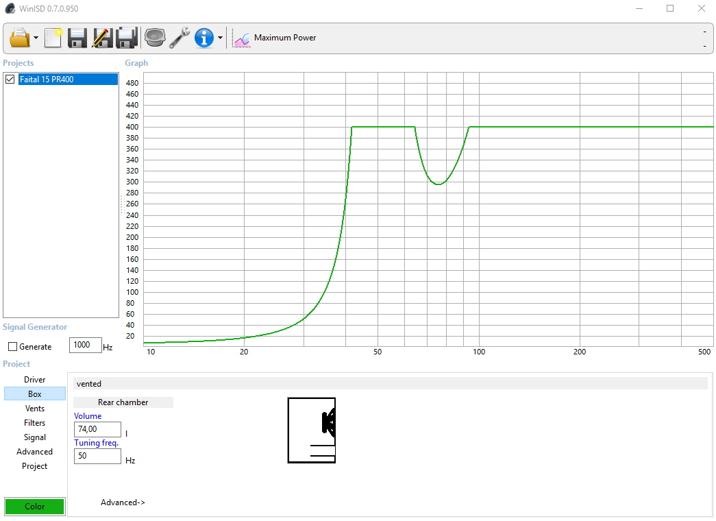 Bei einem 74Liter-Gehäuse und 50Hz Tuning liegt dieser Dip immerhin schon bei 300W. Wenn man da noch einen Thumpinator oder VONG vorschaltet, dann wird diese kleinere und höher abgestimmte Box erheblich mehr Punch und Lautstärke haben als die dicke Kiste , die vielleicht als PA-Box besser klingen mag.