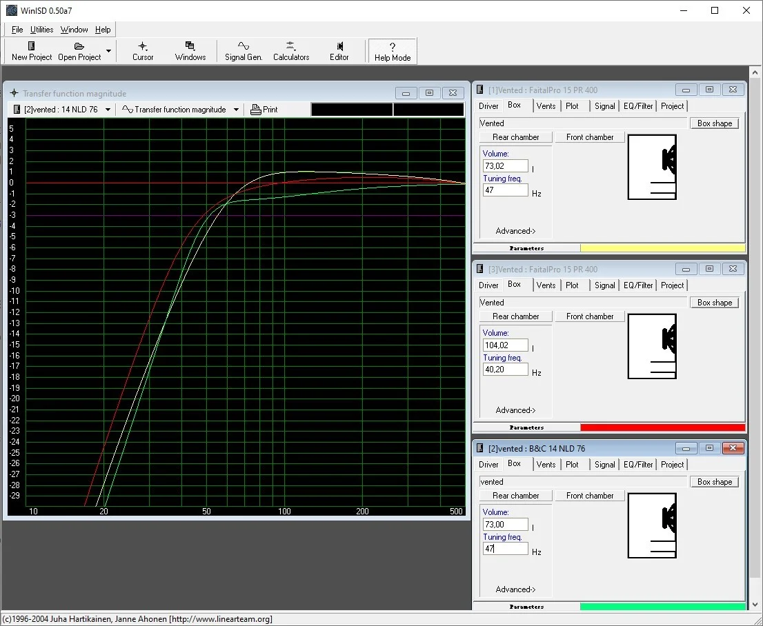 In beiden Beispielen sieht man, dass es kaum Sinn macht, zumindest nicht für Basser. Für spezielle Horngehäuse oder Bandpässe mag das anders aussehen, aber nicht für normale BR-Boxen. Watt-Angaben sind für den tiefen Bassbereich Schall und Rauch!