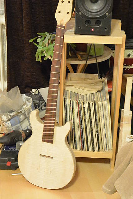 Spielbar, aber noch nicht fertig: es muss noch ein böser Fehler am Halsübergang ausgebessert werden, die geplante Aktivelektronik will noch gebaut werden, und neue Potiknöpfe - etwas kleiner, aus Holz - müssen auch her. Eigentlich brauch ich inzwischen mal sowas wie ein Logo.