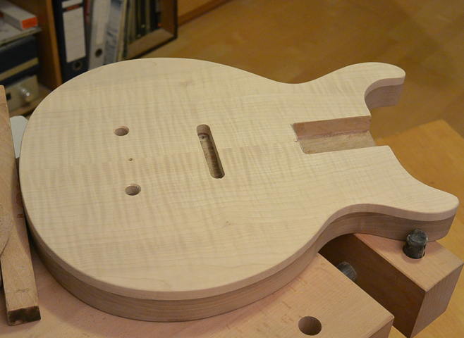 Oberkörpershaping angezeichnet, und zwar für unterschiedliche Spielhaltungen, und schon mal vorgeschlitzt. Jetzt gilt es erstmal, die Außenkontur nachzuarbeiten - dabei hilft eine vernünftige Auflagefläche enorm... und dann wird bei geschlossenem E-Fach konturiert.