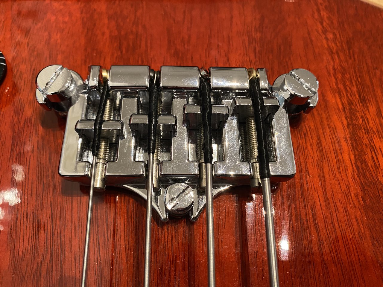 Dann endlich die Dunlop-Flats im Angebot! Zuschlagen! Für 30" passen die ideal, ich musste etwas mit besagter Hülse nachhelfen, damit das dicke Ende nicht um die dünne Mechanik gewickelt wird und die Umspinnung unten auch hinter dem Reiter zu liegen kommt (siehe G-Saite). Und so richtig sauber gerade laufen die Saiten auch nicht vom Sattel zu den Mechaniken - das ist keine Perspektivverzerrung!