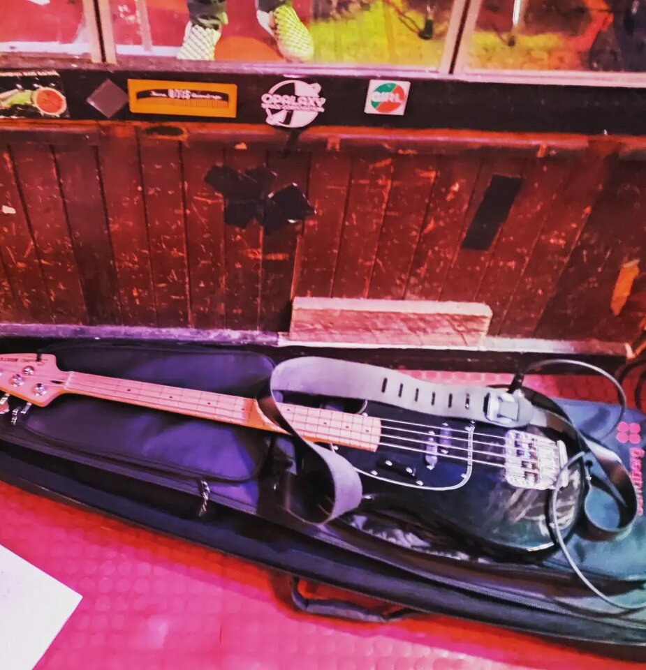 Ich mag das Foto. Weniger wegen das Basses (der ist auch cool, keine Frage), sondern wegen des Gesamteindrucks. Der Boden, die Holzwand, die Spiegel, die Schlappen (Hier mal ein Bild vom letzten Gig.