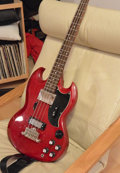 Das Fädchen ist zwar schon älter, aber eigentlich schulde ich Euch noch ein Bild von meinem zweiten Epi EB-3. Der ist jetzt endlich "fertig" modifiziert: Artec-Mudbucker mit zusätzlichem Eisen anstelle der Polschrauben und parallel geschaltet, ein Wilkinson Minihumbucker mit Keramikmagnet und badewannigerem Ton als der Original-PU, Zusatzmasse an der Kopfplatte und einer ausgesteiften 3-Punkt-Brücke. Klanglich ist er jetzt endlich auf dem Level seines weißen Schwesterchens, aber anders, näher am Original.