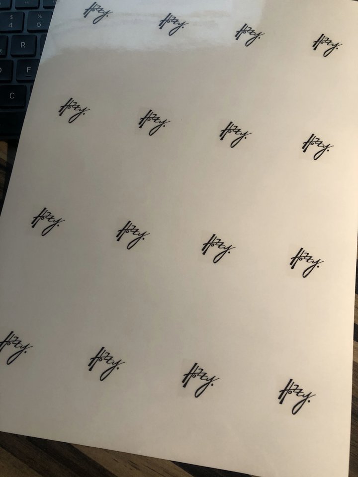 Ich habe die Signatur auf einem weißen Blatt Papier entworfen, dann ein Bild davon gemacht, dann das Ganze mit Photoshop überarbeitet und dann auf selbtsklebende, transparente Folie gedruckt.