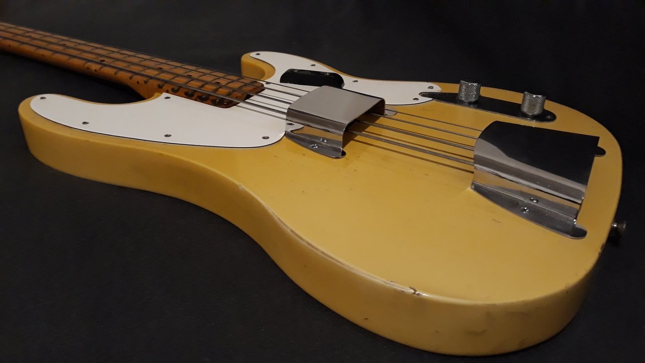 Fender Musicmaster abgekauft. Der kam ganz original und klassisch mit Strat-Pickup, eingerissener Ecke beim Pickguard und Brücke mit 2 Sätteln.