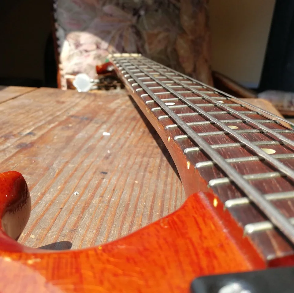 Wenn ich den Bass umdrehen und vom Halsfuss nach in Richtung Kopfplatte schaue, dann ist die linke Seite (E) gleichmäßig gebogen, auf der rechten Seite (G) ist ein Knick in Höhe des 7-8 Bundes zu erkennen. Der Hals wirkt ein wenig wellig. Kennt ihr das Problem? Ist das eine optische Täuschung?