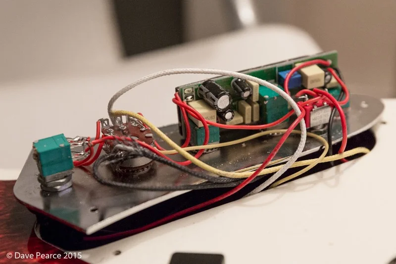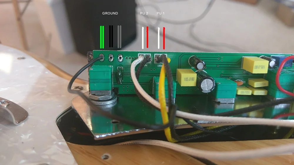 DiMarzio konnte mir allerdings mit dem Verbau an der Elektronik-Schaltplatte der Elektronik nicht weiterhelfen. Bisher gibt es ja für jeden Pick-Up zwei Lötstellen. Die DiMarzio kommen da Noisecancelling/Noiseless durch ihre Beschaffenheit mit 5 Kabeln pro Pickup!