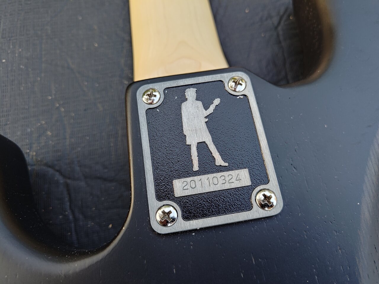 Neue Schrauben. Nicht wundern. An der Unterkante vom Bass habe ich einen Gummistreifen aufgeklebt. Das mache ich damit mir die Gitarren im Sitzen nicht so leicht vom Bein rutschen.