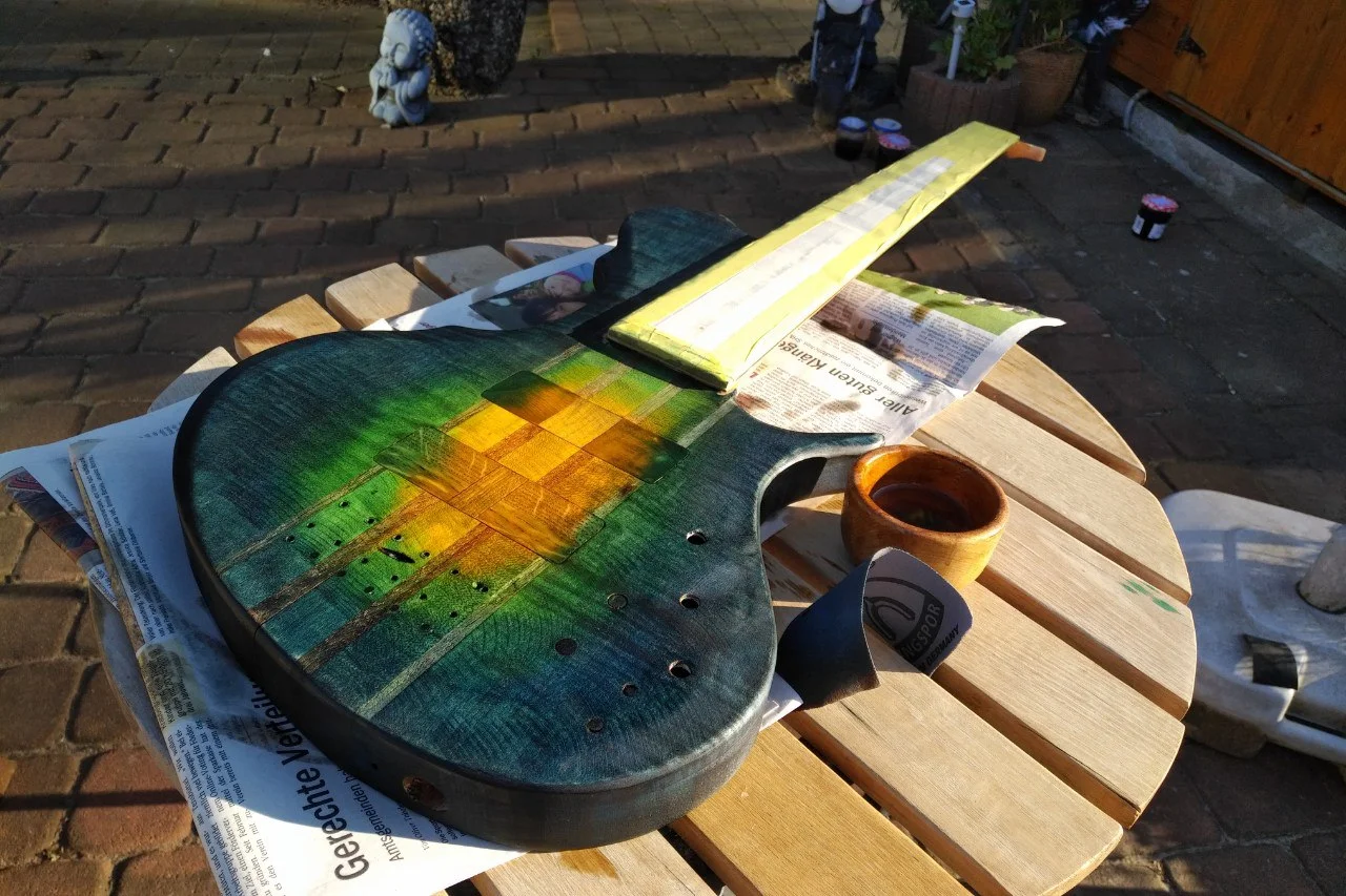 Fürs Body-Finish hatte ich noch ein paar Gläser mit Beize in verschiedenen Farben von früheren Projekten übrig. Ich hab einfach mal losgelegt und war am Ende überrascht, wie gut das zusammenpasst
